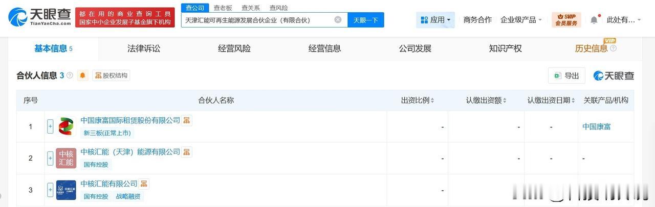【中核汇能等在天津成立可再生能源发展合伙企业 出资额31.7亿】 天眼查工商信息显示,近日,天津汇能可再生能源发展合伙企业(有限合伙)成立,执行事务合伙人为中核汇能(天津)能源有限公司,出资额31.7亿人民币,经营范围含发电业务、输电业务、供(配)电业务,风力发电技术服务,太阳能发电技术服务,节能管理服务,发电技术服务。合伙人信息显示,该合伙企业由中国康富国际租赁股份有限公司、中核汇能(天津)能源有限公司、中核汇能有限公司共同出资。 天眼查信息: