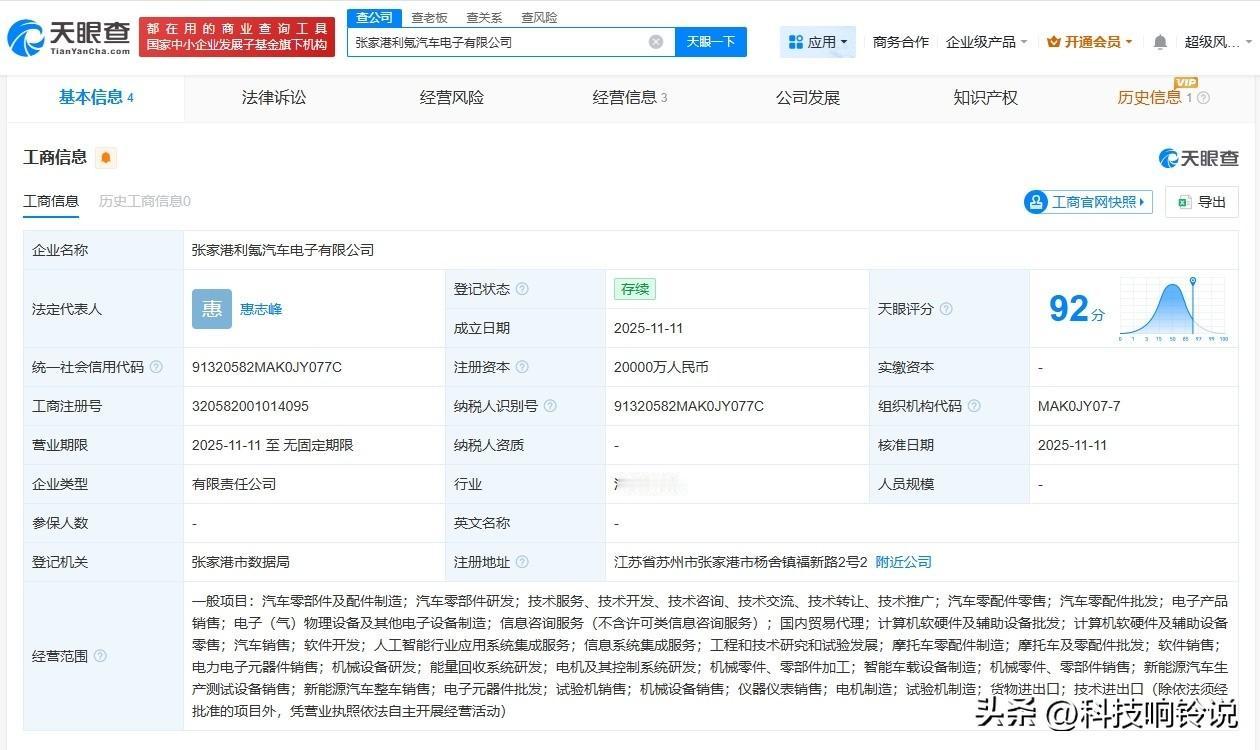 【利氪科技在张家港成立汽车电子公司 注册资本2亿】 天眼查App显示,近日,张家港利氪汽车电子有限公司成立,法定代表人为惠志峰,注册资本2亿人民币,经营范围包括汽车零部件及配件制造、汽车零部件研发、汽车零配件零售等。股东信息显示,该公司由利氪(浙江)科技有限公司全资持股。 天眼查信息: