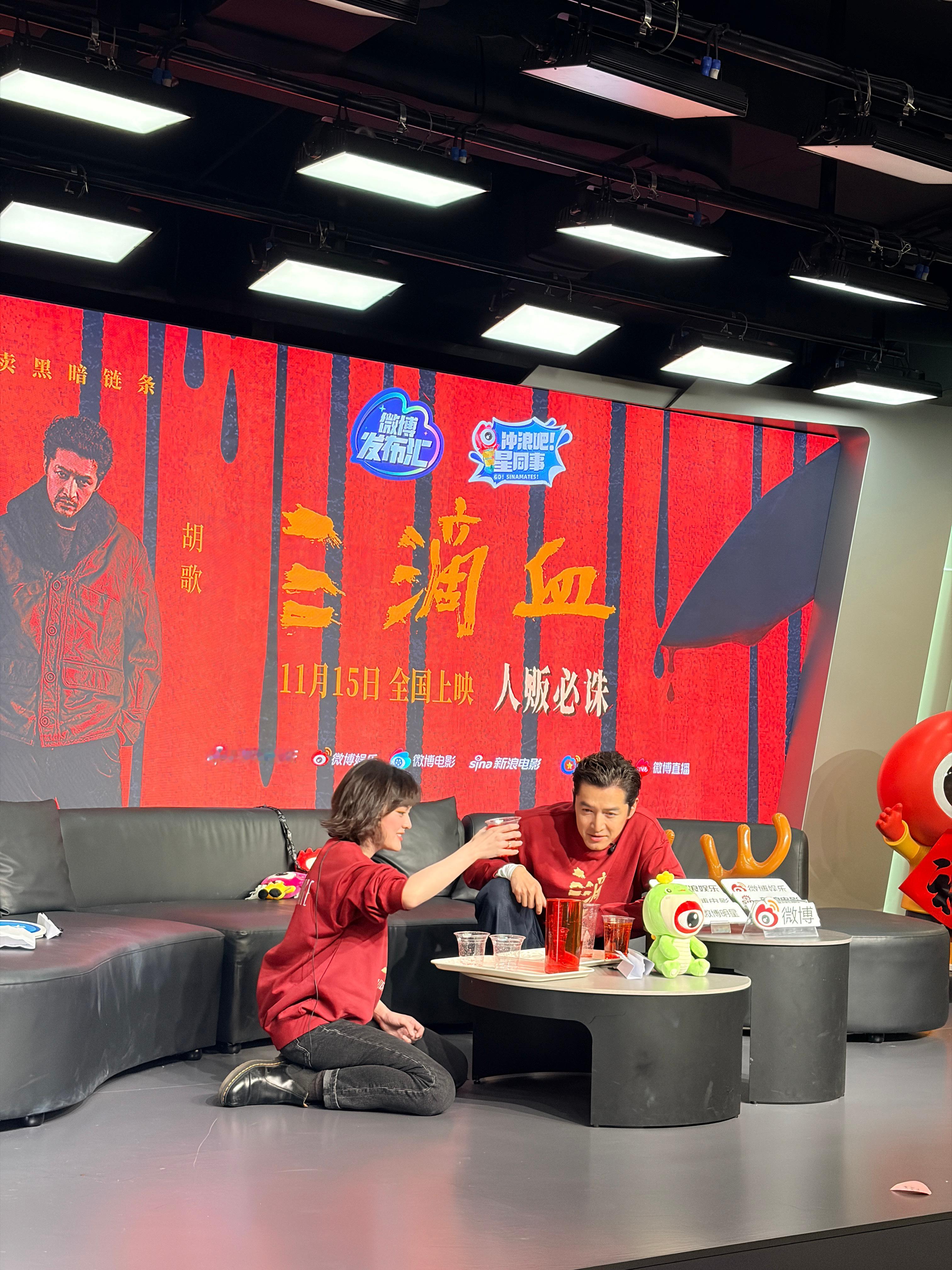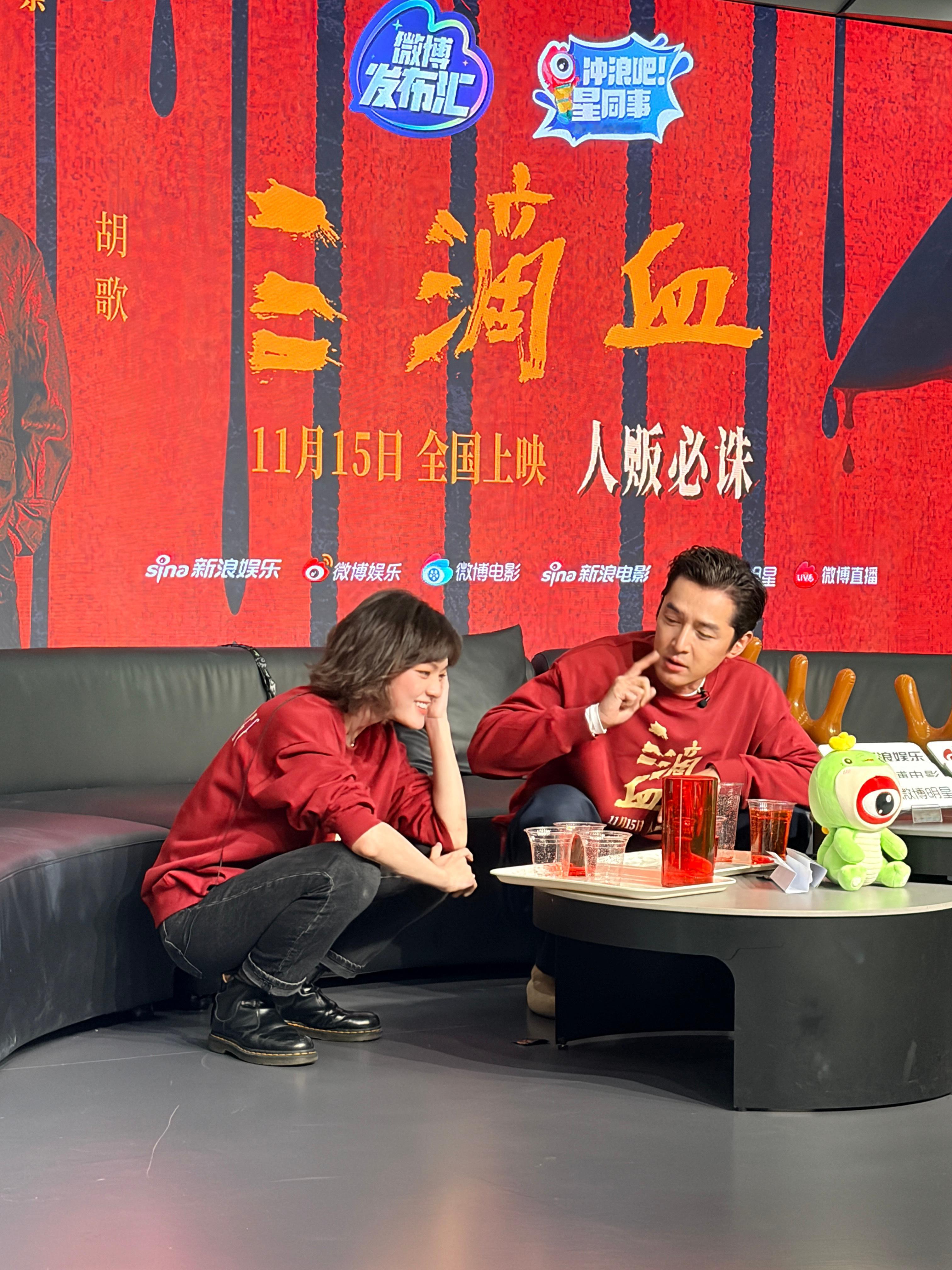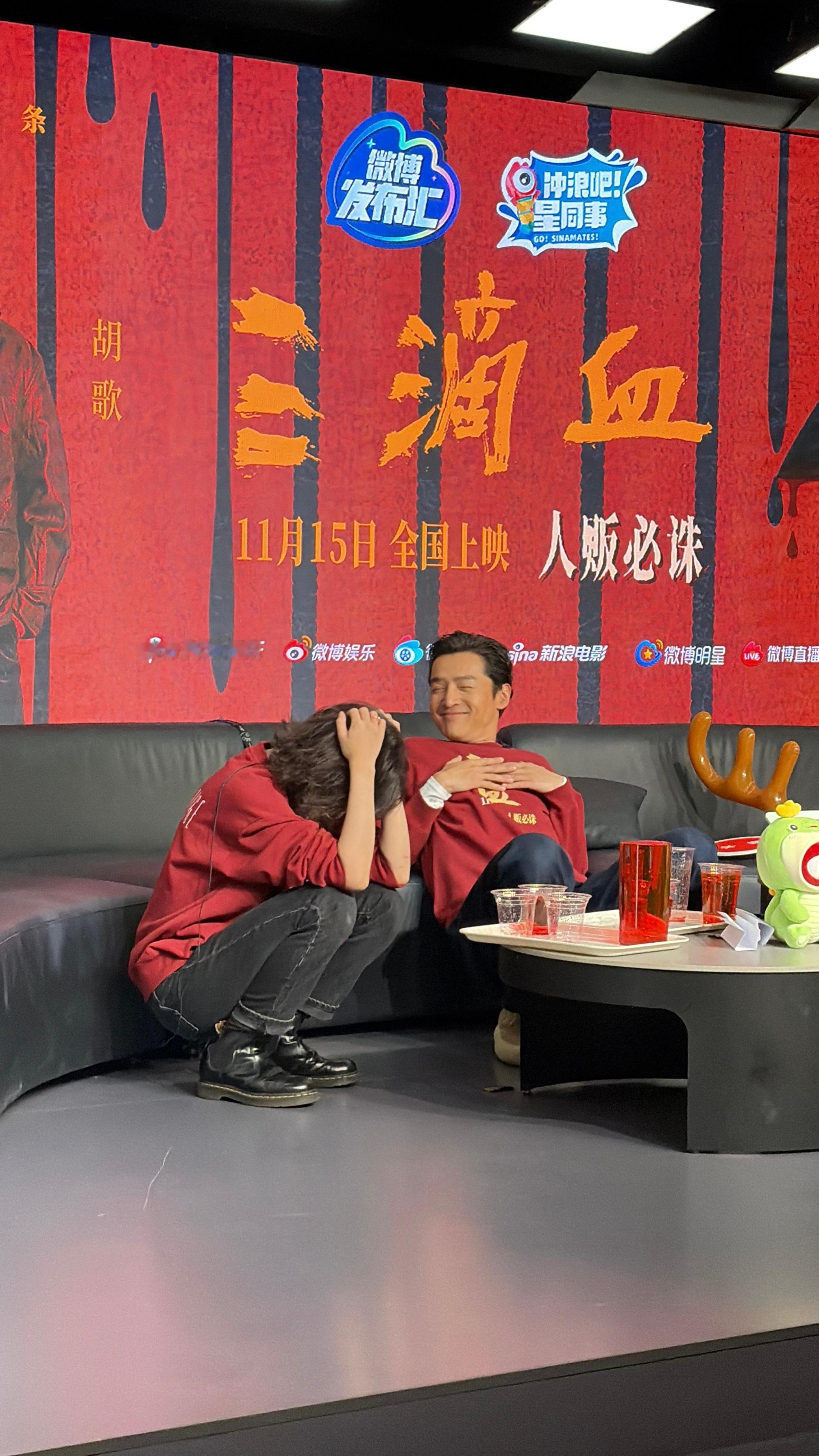 《三滴血》扫楼,胡歌赢了把奖励的大红花送给了文淇,可爱二人组