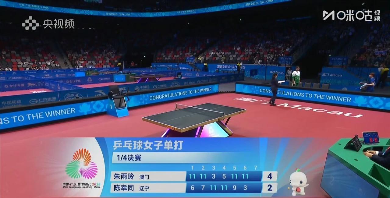 朱雨玲淘汰陈幸同晋级女单四强! 刚刚结束的一场第15届全运会乒乓球女单1/4决赛中, 澳门省队老将朱雨玲4-2击败陈幸同,顺利晋级女单四强,六局比分为:11-6,11-7,3-11,5-11,11-9,11-3。 朱雨玲的相持和速度完全不落下风,感觉陈幸同第五局领先被反超之后心态就崩溃了,导致第六局完全下风,仅得了3分。 朱雨玲真是励志楷模,目前完全恢复到一流水平了。 下一轮朱雨玲将对战孙颖莎VS刘斐的胜者 ,她很久都没有和莎莎对阵了,这次终于要和莎莎站在同一张球台两端了[奋斗]。