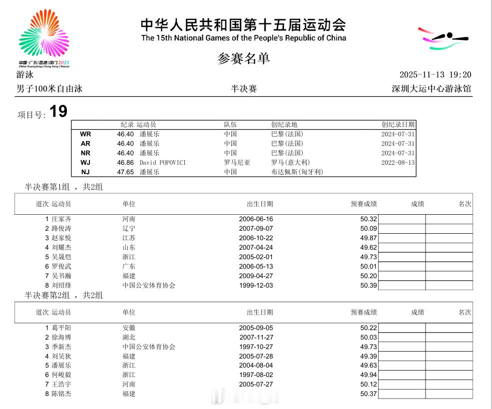 陈昊和wy弃权100自半决赛,刘绍烽和陈铭杰递补晋级
