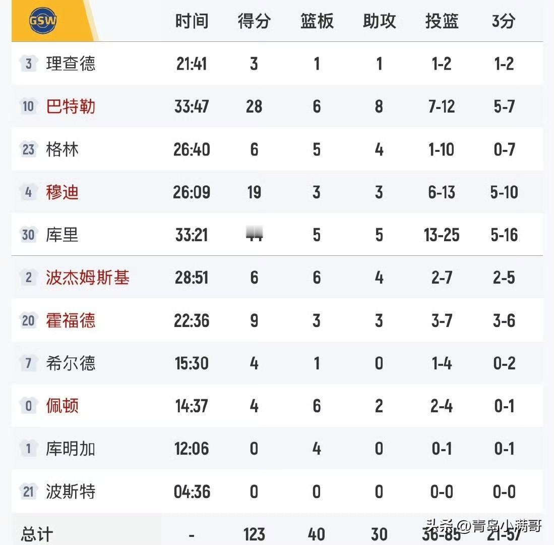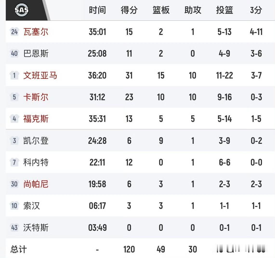 还是库日天!!!库里45+5+5,文班亚马31+15+10,勇士逆转马刺! 北京时间11月13日,勇士继续客场之旅有,今天他们来到了圣安东尼奥挑战状态不错的马刺队,目前马刺排名西部第二,但是本场比赛勇士在第三节狂飙43分,最终125-120战胜马刺队,逆转获胜。 本场比赛库里依然是那个库日天,全场砍下44分,还有16次罚球,但是他三分手感不好,只有16中5,追梦更差,直接三分7中0,好在穆迪和巴特勒手感不错,两人合计投进了10记三分球。 马刺方面,文班亚马31分15篮板10助攻的大号三双,卡斯尔也拿下了三双23分10篮板10助攻,一支球队有两个拿下三双但是还没有赢球也是比较罕见。 马刺的两个年轻人一起拿下三双但是输球就太可惜了,而且文班也是真的想拿下这场比赛。 勇士队 库里 斯蒂芬·库里 文班亚马