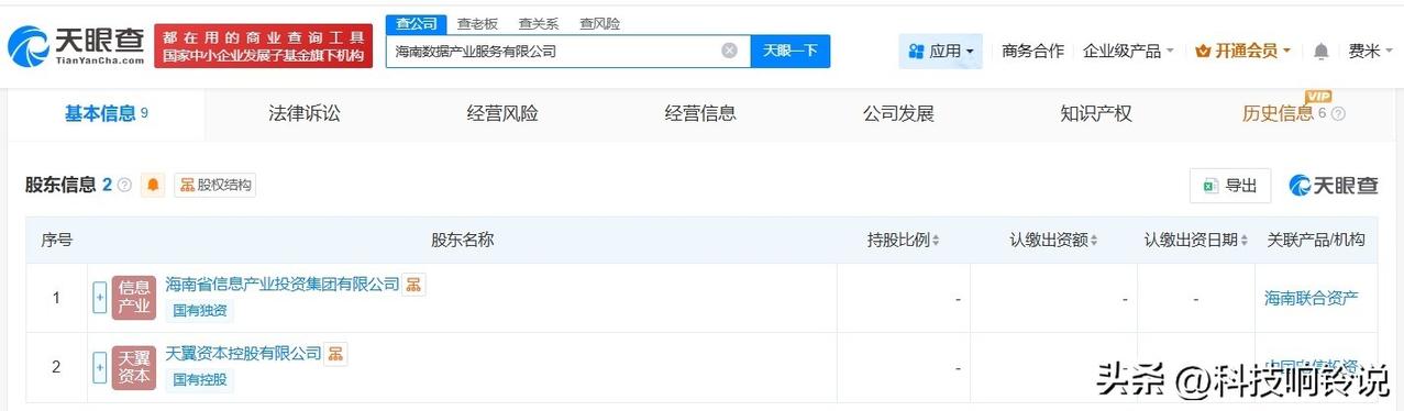 【中国电信等在海南成立数据产业服务公司 注册资本1亿】 天眼查工商信息显示,近日,海南数据产业服务有限公司成立,法定代表人为陈文思,注册资本1亿人民币,经营范围包括第一类增值电信业务、第二类增值电信业务、互联网直播技术服务、信息网络传播视听节目等。股东信息显示,该公司由中国电信(601728)旗下天翼资本控股有限公司、海南省信息产业投资集团有限公司共同持股。 天眼查信息: