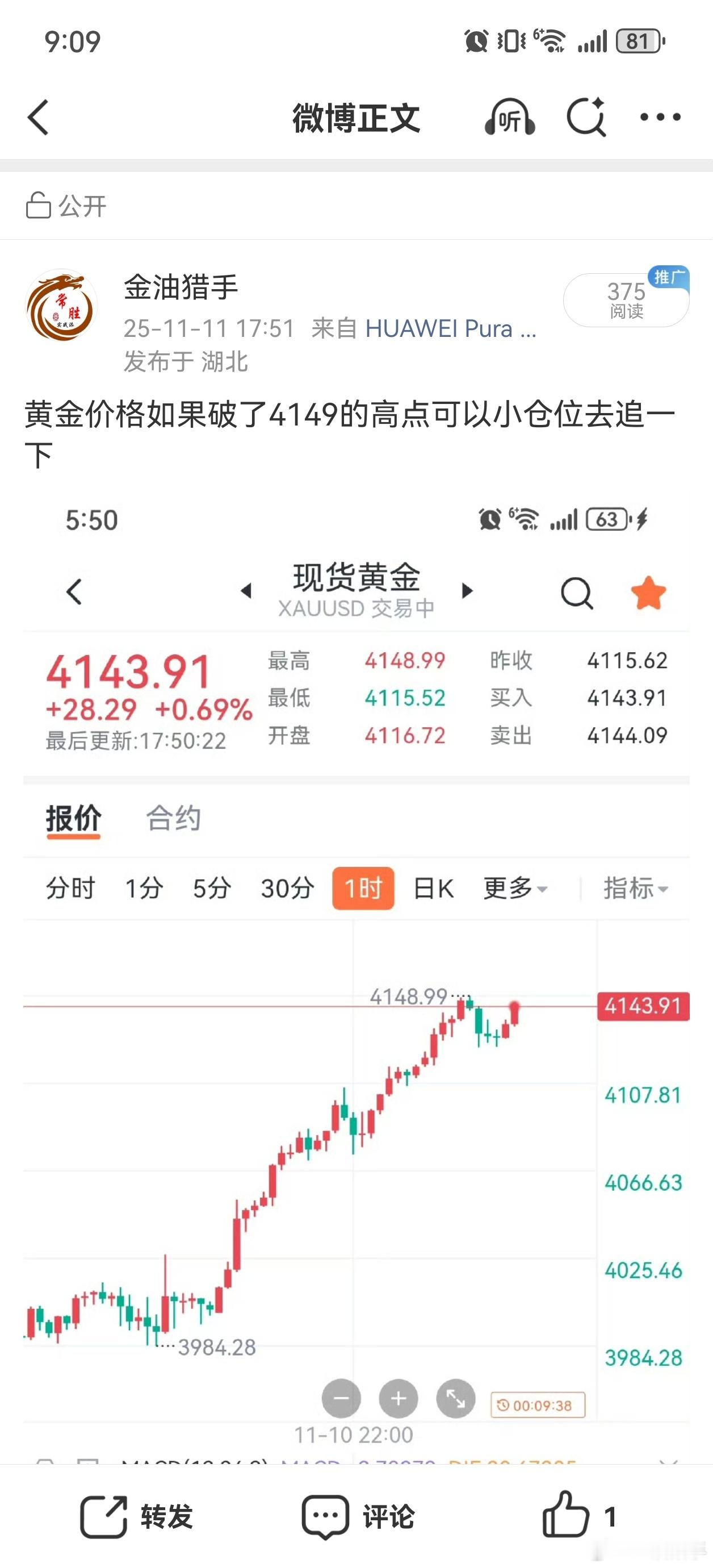 黄金价格突破4149后顺势拉涨,直接到了4210之上