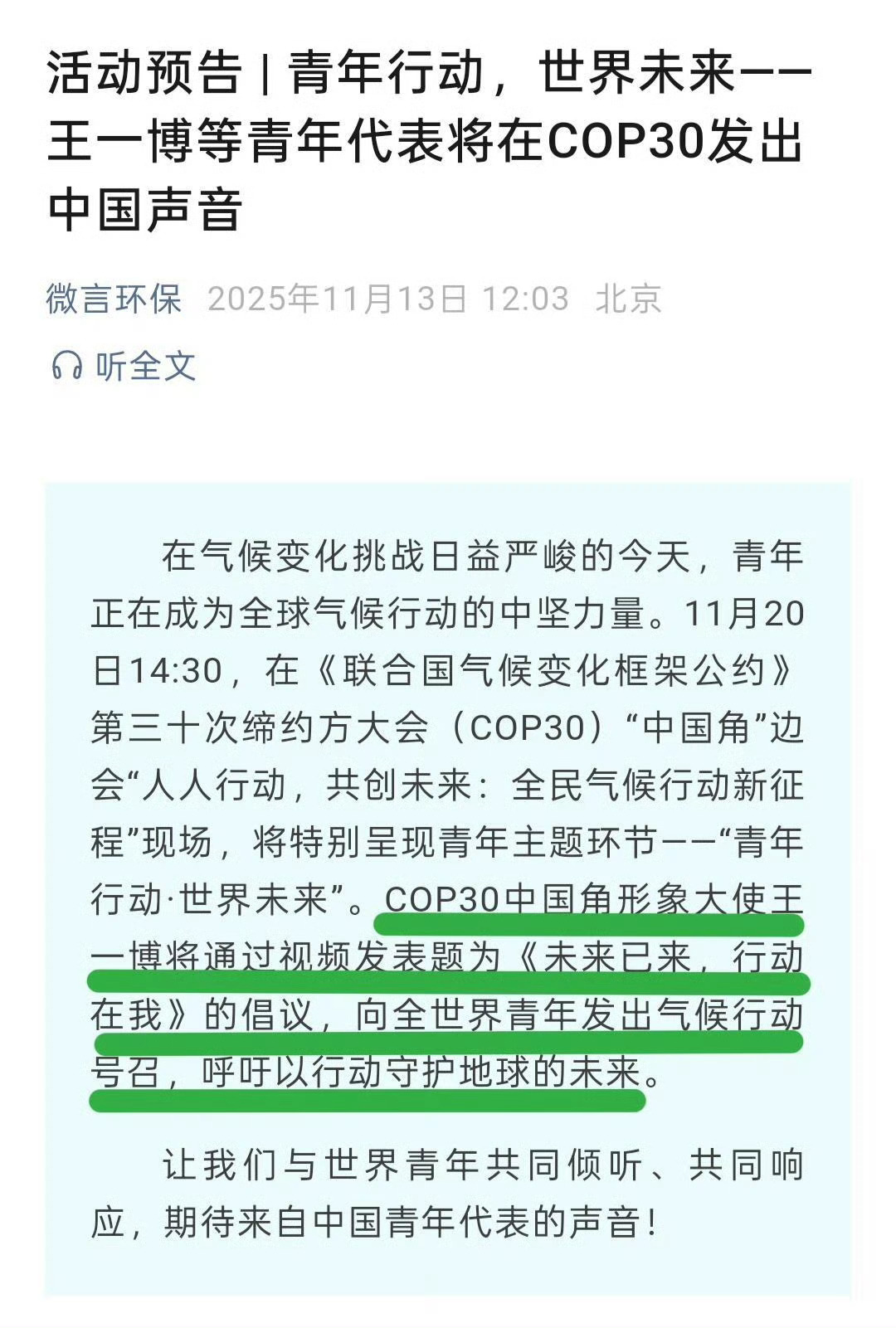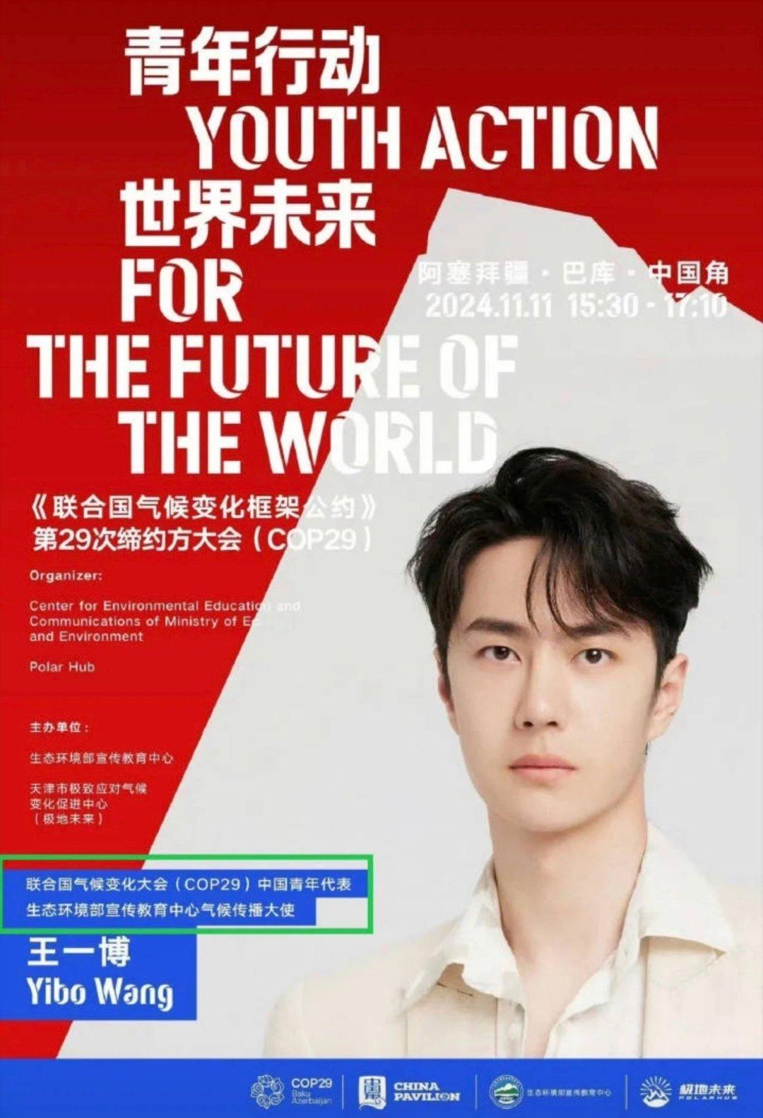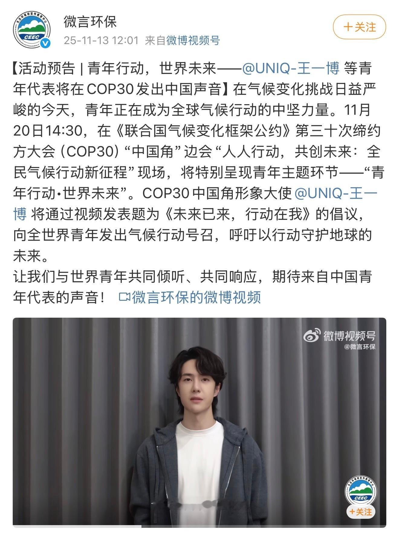 太棒了!恭喜王一博 作为COP30中国角形象大使 将在联合国为环境保护和气候治理发出中国青年的声音 好优秀