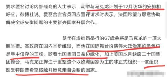 特朗普提出G2之后,法国总统马克龙明显有点坐不住了!外媒曝光,马克龙正在筹划一个大计划,邀请中国出席G7会议!11月13日,美国彭博社称,马克龙拟邀请中国参加明年七国集团峰会,G7峰会明年将在法国举行,外媒称法国已经与一些盟友讨论过这一想法。为什么马克龙有此计划呢?这主要有两方面的原因。   马克龙这几年在国内的日子可不好过,黄背心运动闹得沸沸扬扬,退休改革法案差点把巴黎给掀了,经济数据更是半死不活。   老百姓怨声载道,支持率跌得比过山车还刺激。这种情况下,马克龙能打的牌真不多了,唯独外交这块儿,还能让他刷刷存在感。   法国好歹也是联合国五常之一,欧盟里的大哥大,要是能把中国这个全球第二大经济体拉进G7,那马克龙在国际舞台上的分量可就不一样了。这招儿说白了就是“内政不行外交来凑”,通过搞个大新闻转移国内视线,顺便给自己攒点政治资本。   再看看G7这个圈子本身,早就不是当年那个呼风唤雨的“富人俱乐部”了。想当年G7峰会可是全球经济的指挥棒,现在呢?连个像样的联合声明都凑不出来,内部矛盾比菜市场还热闹。特朗普更是直接把G7当成了自家后院,想来就来想走就走,今年连G20都直接缺席,摆明了不把老伙计们当回事。   马克龙心里门儿清,再这么下去,G7迟早要变成G6甚至G5。这时候把中国请进来,既能给G7注入点新鲜血液,又能借中国的影响力逼特朗普就范——毕竟中国要来了,特朗普总不能又当缩头乌龟吧?   马克龙这招儿其实挺冒险的。G7里头除了法国,其他几个国家对中国可都不怎么友好。美国那边肯定第一个跳出来反对,日本、加拿大也都是跟班。   德国虽然跟中国生意做得大,但默克尔快下台了,新政府啥态度还两说。马克龙这是在刀尖上跳舞,稍有不慎就可能被孤立。   但他也没办法,总比看着G7慢慢凉掉强。而且法国一直想搞“欧洲战略自主”,不想老跟着美国屁股后面转,拉中国入局正好能平衡一下美国的影响力。   特朗普提出的G2构想,说白了就是想跟中国联手统治世界,把其他盟友都晾在一边。   这可把马克龙给吓坏了,法国好不容易才在欧盟里混出点地位,要是真让中美两家说了算,法国不就成了小跟班?所以马克龙必须赶紧行动,要么把中国拉进G7稀释美国的影响力,要么就自己另起炉灶。   这次邀请中国参加G7,就是马克龙打出的一张王牌,既是对特朗普G2构想的回应,也是法国争取国际话语权的一次豪赌。   说到底,马克龙这是在下一盘大棋。国内危机四伏,国际地位下滑,他急需一场外交胜利来扭转局面。邀请中国参加G7,既能提升法国的国际形象,又能给G7续命,还能牵制特朗普,简直是一箭三雕。当然,这事儿能不能成还得打个问号。中国愿不愿意来是个问题,G7其他成员国同不同意也是个问题。但不管怎么说,马克龙这一手确实够大胆,够出人意料,也够有魄力。要是真成功了,那明年法国的G7峰会可就有好戏看了。   其实马克龙早就对中国抛过橄榄枝了。前几年他就说过“G7已经过时”,主张搞个更包容的G10或者G11。这次直接邀请中国,算是把想法付诸行动了。   法国一直想当中美之间的“桥梁”,既不想完全倒向美国,也不想跟中国对着干。这种独立自主的外交路线,在当今这个乱糟糟的世界里,确实挺难得的。马克龙这是在赌,赌法国能在大国博弈中找到自己的位置,赌欧洲能摆脱对美国的依赖。   从更深层次来看,马克龙这举动反映了国际格局的深刻变化。G7代表的是旧秩序,而中国代表的是新兴力量。当旧秩序越来越难以维持,就必须做出改变。马克龙算是看明白了,与其被动接受变化,不如主动引领变化。   邀请中国参加G7,就是法国在适应这个变化的过程中,为自己争取更多主动权的一次尝试。这事儿无论成败,都标志着国际政治正在进入一个全新的阶段。