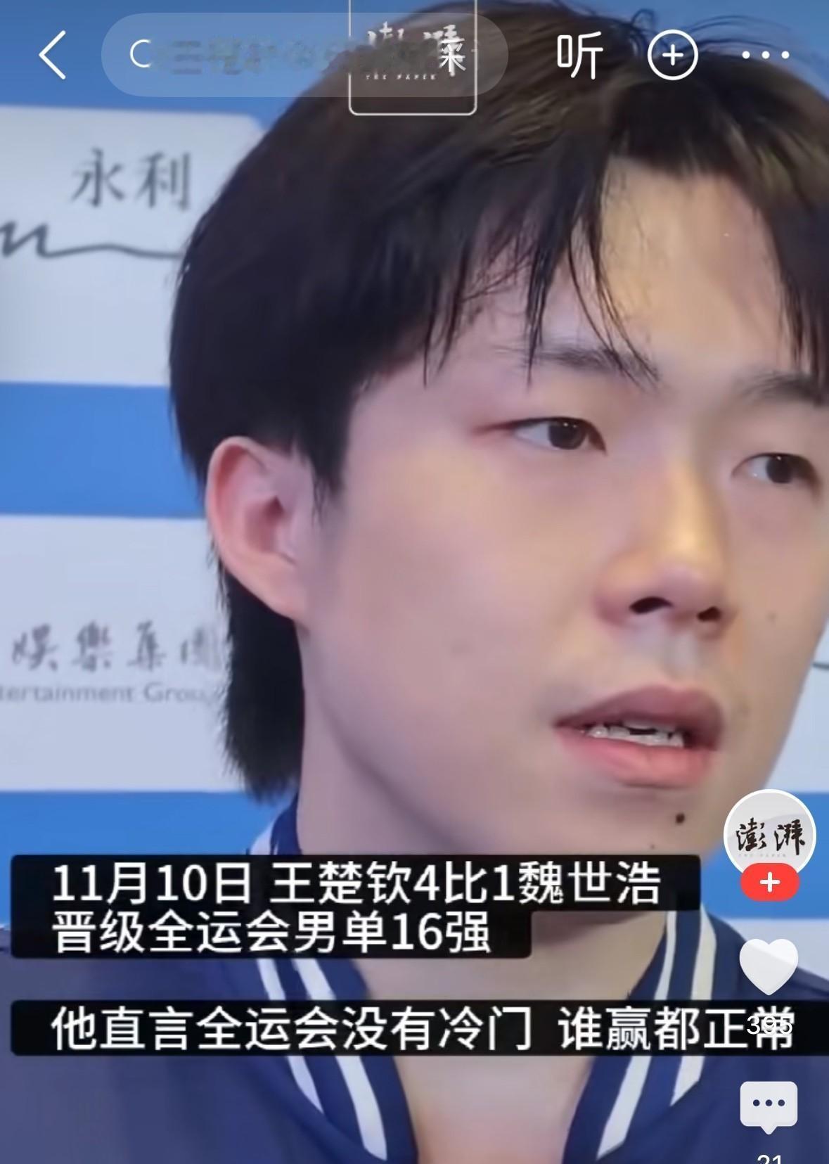 近日,王楚钦在全运会赛事结束后接受媒体采访,谈及与老对手“高端局”选手的再次交锋