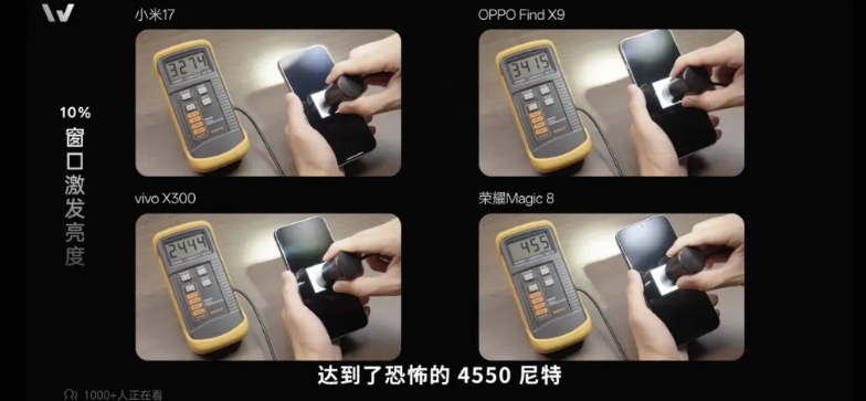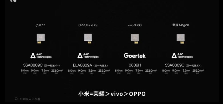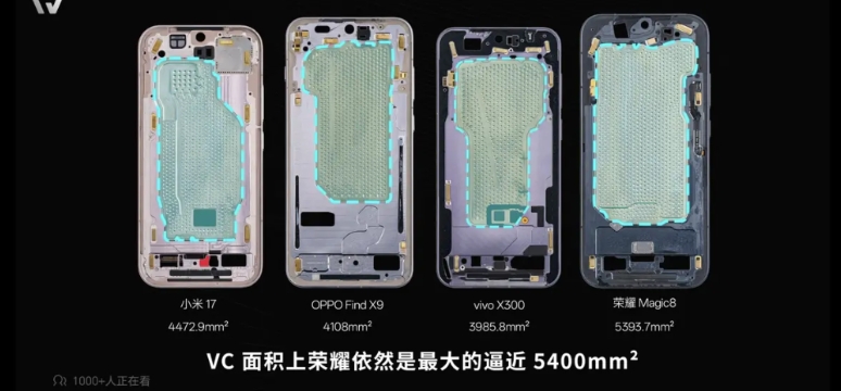 屏幕激发亮度最高达到4500尼特,相比之下友商有的只有2000多尼特,差距比较大。至于马达方面,荣耀Magic8和小米17差不多,比其他友商也要略好一些,标准版也没有用0809马达。散热面积也不小达到5400mm²,难怪是跑分最高的标准版手机,感觉堆料非常扎实。
