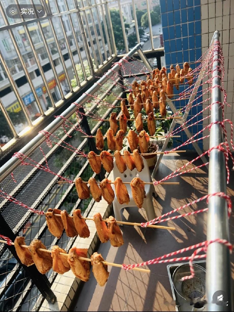 阳台晒鸡翅被邻居围观了! 今早把阳台改成“风干鸡翅流水线”,30根竹签串满鸡翅