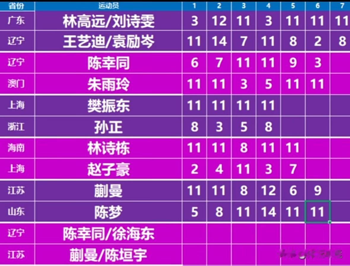 樊振东、林诗栋强势晋级!陈幸同、蒯曼分别不敌朱雨玲和陈梦无缘半决赛! 北京时间11月13日全运会乒乓球单打1/4决赛战报新鲜出炉。女单赛场,陈幸同2-4被朱雨玲逆转,遗憾出局;陈梦则4 -2逆转蒯曼成功晋级。此前陈梦回归赛场表现出色,首秀4-0横扫孙铭阳,这次对阵蒯曼又展现出强大实力。 男单这边,樊振东状态神勇,4 - 0零封孙正;林诗栋也以4 - 1战胜赵子豪。比赛越到后面越激烈,毕竟都是高手过招,容错率极低。接下来的比赛肯定更精彩,让我们拭目以待谁能最终夺冠! 蒯曼陈幸同 蒯曼 蒯曼陈熠