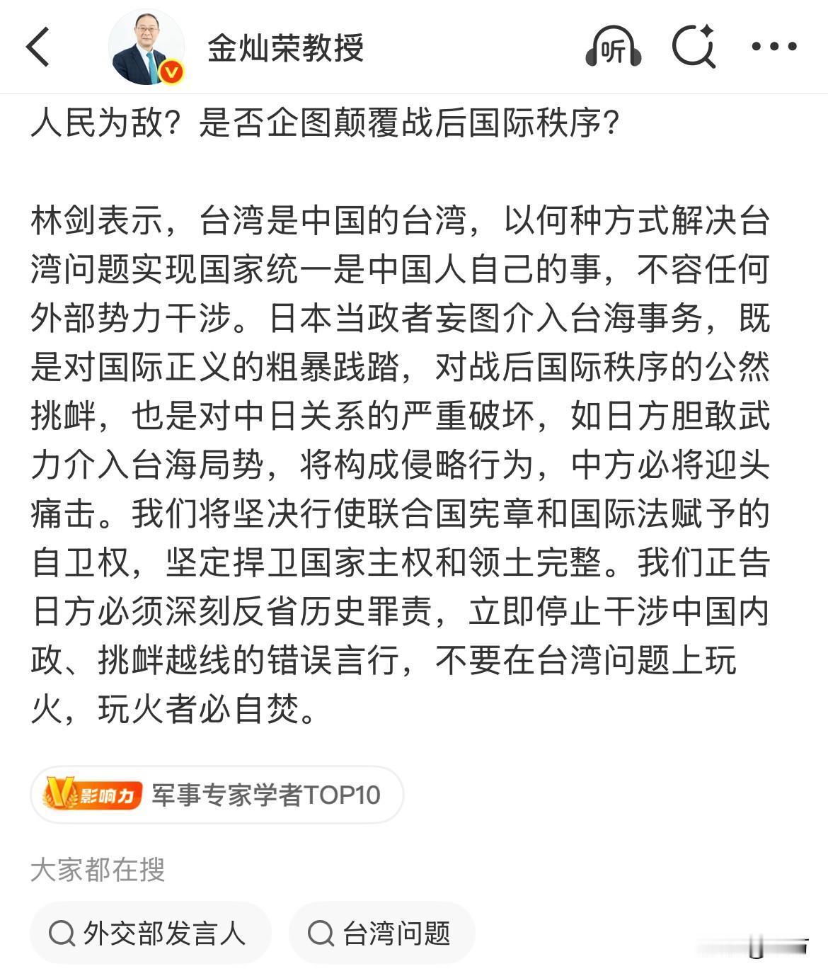 金灿荣教授:这次我们的回应比较的硬! 就在刚才才,金灿荣教授引用了今天我们外交部的一段报道,这次没有一点弯弯绕绕,非常的直接! 大概的意思是这样的:小日子胆敢武力介入台海局势,那么将构成事实上的侵略行为,我们必将迎头痛击! 好久没有看到这么硬气的表述了,我们通过官方的这一份比较长的报道上面可以看到,这次说话的风格和以往区别还是比较大的,毕竟是我们自己的事情,小日子在一旁蹦蹦跳跳的! 他还以为自己能够掀起几朵浪花似的,殊不知现在与几十年前情况完全不一样,而且不管是我们的态度,还是我们的真实实力,都不能够容忍在这件事情上指手画脚。 所以今天的阶段报道,看起来是非常的酣畅淋漓,其实我们就是要对这种事情早点把态度拿出来,让小日子早点知道我们对我们自己事情的看法和态度,不然指不定今后他还想搞出什么幺蛾子出来。