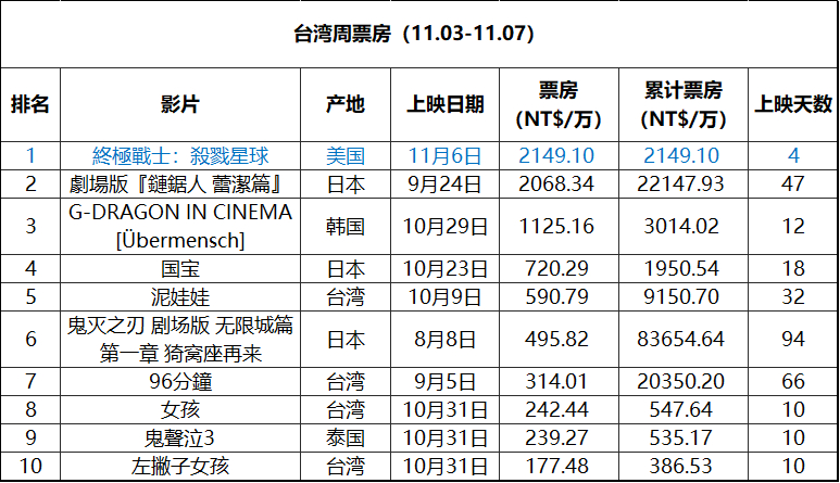 2025年第45周 :1.《铁血战士:杀戮之地》开画夺冠;2.《链锯人 剧场版:蕾塞篇》累计票房2.21亿超《柯南》排名年度第5;3.《国宝》后劲强势,累计票房破2000万。(单位:新台币 数据:台湾电影及视听文化中心)