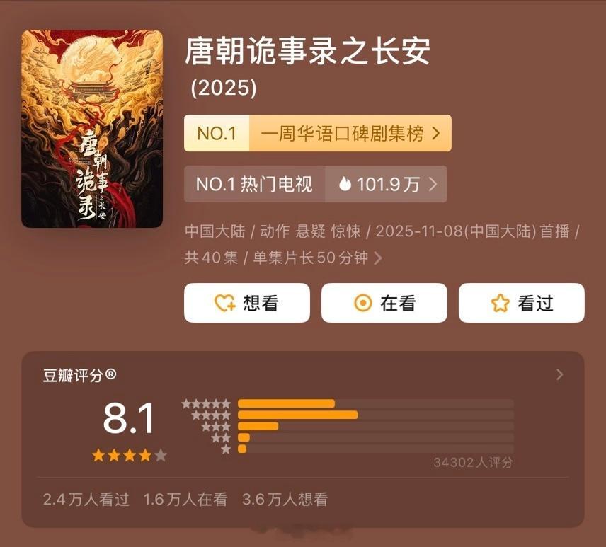 《唐朝诡事录之长安》开分真快,没播几集就开分了。《唐诡》系列是真牛啊,三部均破8分。《唐朝诡事录》8.0 《唐朝诡事录之西行》8.6《唐朝诡事录之长安》8.1试问太少有国产系列剧能做得到,不是大家不愿意追剧,而是要看剧的质量是否过硬,《唐诡》给古装剧上了一课,没有流量明星扛的剧,也能大爆,也能得到剧迷们的喜爱。休整了几天,又要重启追剧模式了。冲鸭~🦆