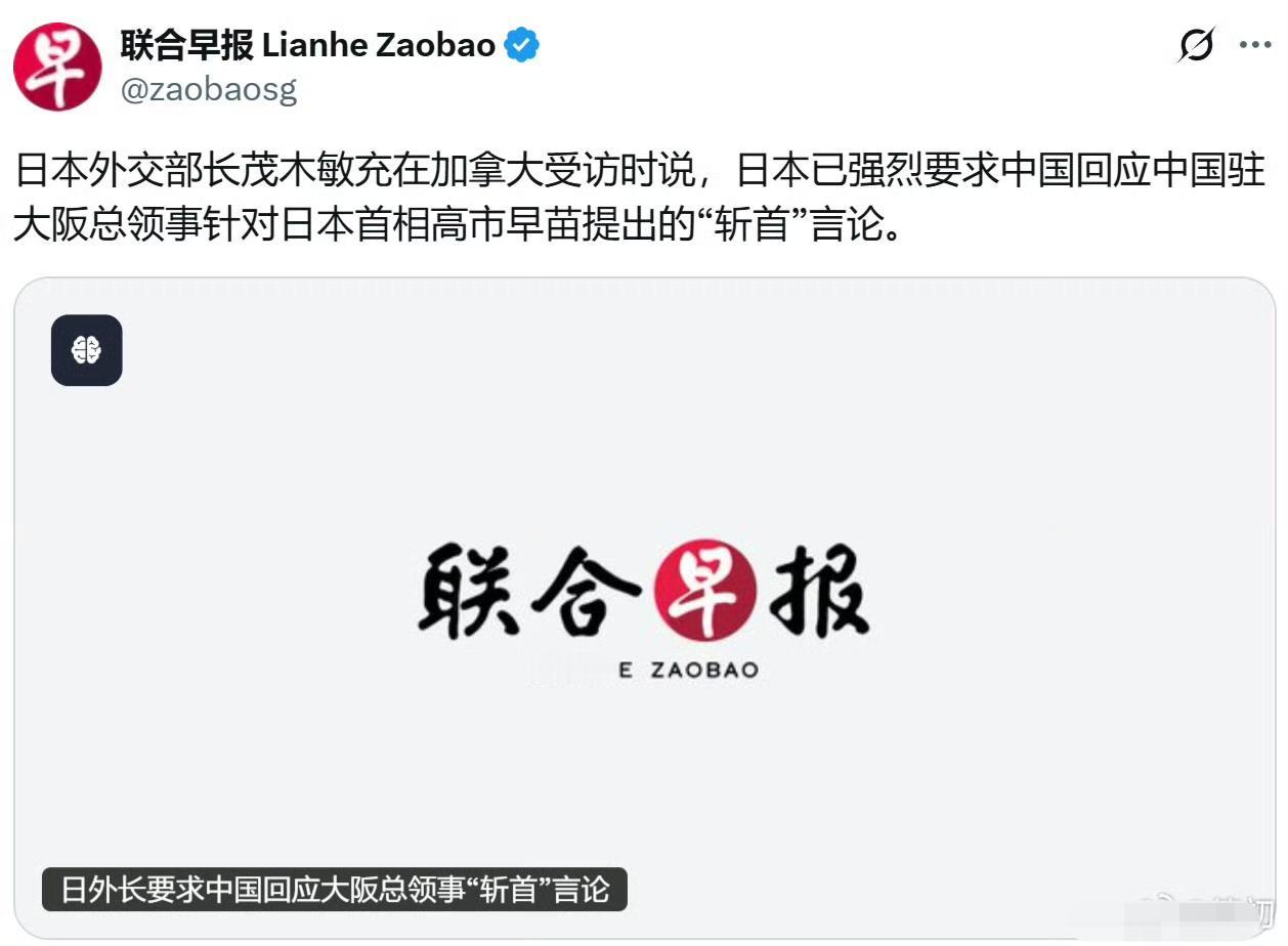 日本外交部长茂木敏充在加拿大受访时说,日本已强烈要求中国回应中国驻大阪总领事针对日本首相高市早苗提出的“斩首”言论。 回应了啊,“高市早苗的脑袋被驴踢了”,这就是中国的回应啊!