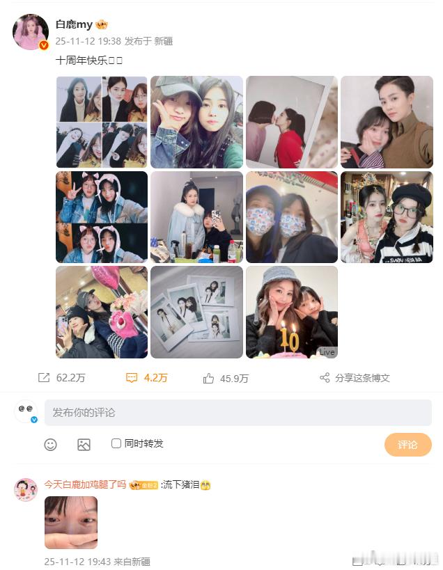 白鹿回复呵呵:如果友谊超过七年,那它将持续一生,一鹿呵护必须要做一辈子的好朋友了,十周年快乐