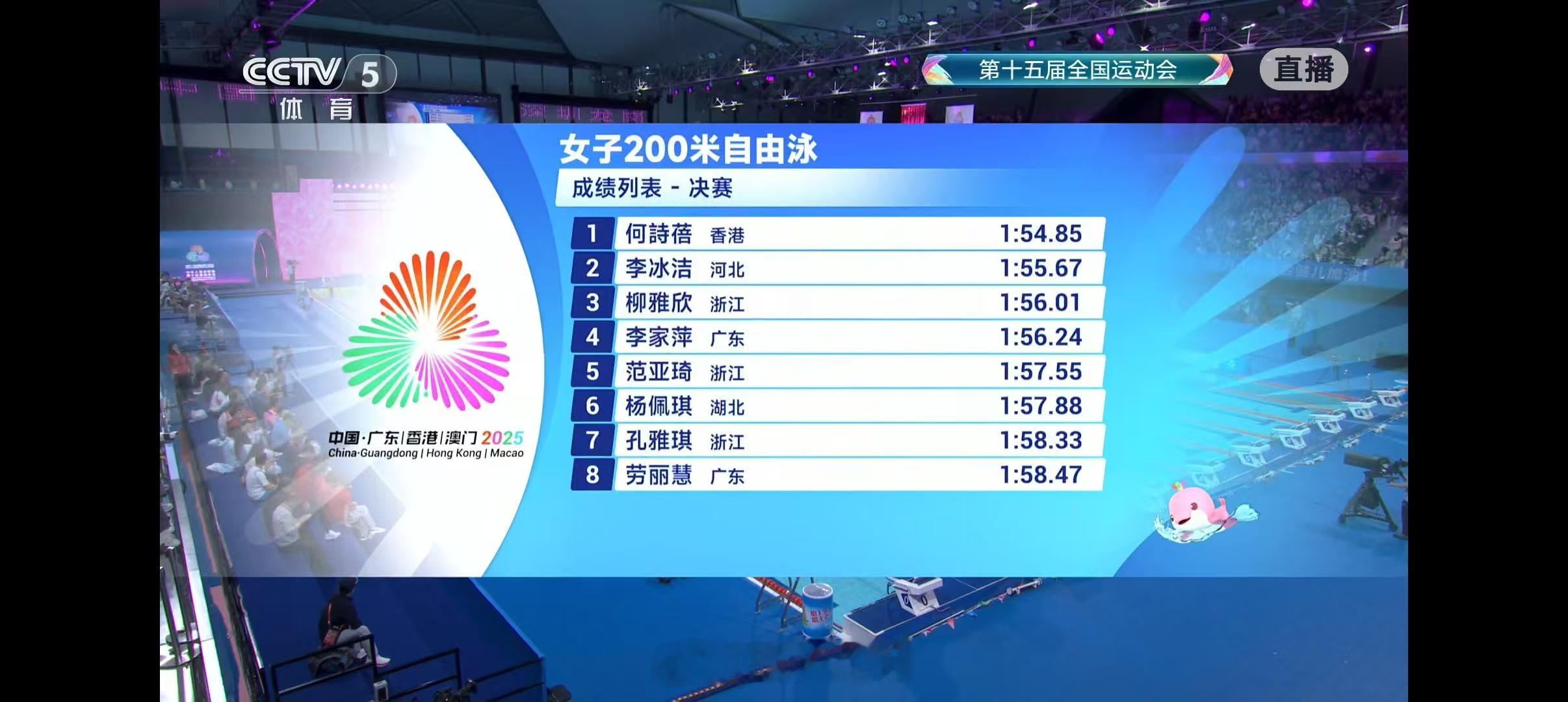女子200米自由泳决赛🥇何诗蓓 1:54.85,女子200米亚洲纪录保持者香港选手何诗蓓首次参加全运会首秀就获得个人首块全运会金牌🥈李冰洁 1:55.67🥉柳雅欣 1:56.01