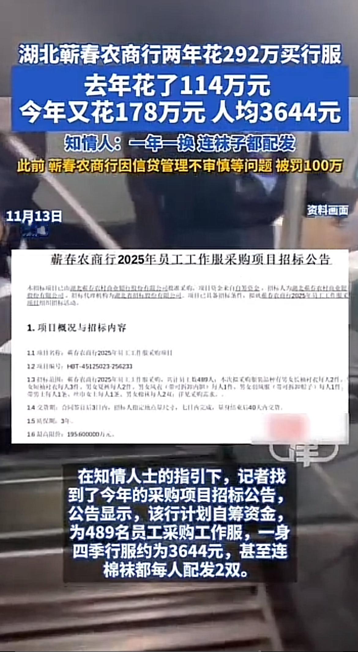 湖北蕲春农商行这操作真是让人惊掉下巴!两年花292万买行服,人均3644元,而且还是一年一换,连袜子都配发。要知道,去年花了114万,今年又花178万,这手笔可真不小。 虽说银行统一服装展示形象无可厚非,但一年一换也太浪费了吧。更让人无语的是,此前该行还因信贷管理不审慎被罚100万元。一边是在员工行服上大肆花钱,一边却是信贷管理问题频出,真不知道他们把精力都放在哪儿了,希望能好好反思,把钱花在刀刃上。
