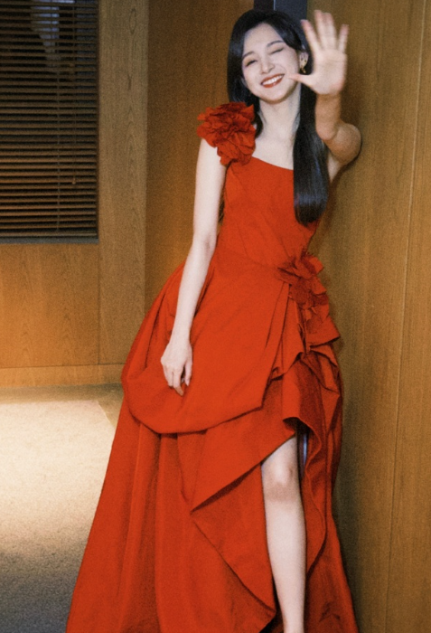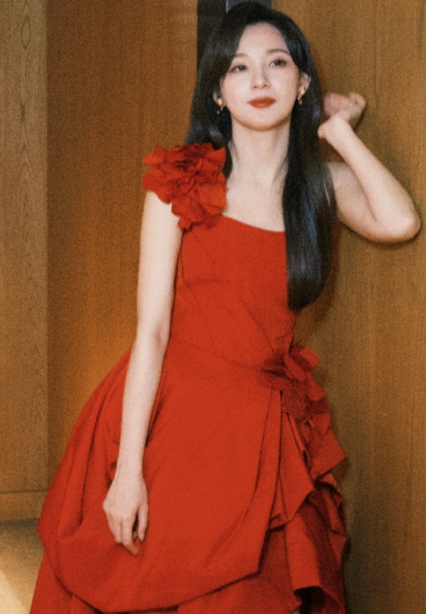 刘亦菲把死亡玫粉穿出了定制款的感觉,这种颜色普通人穿上分分钟黑三度,她居然能穿出