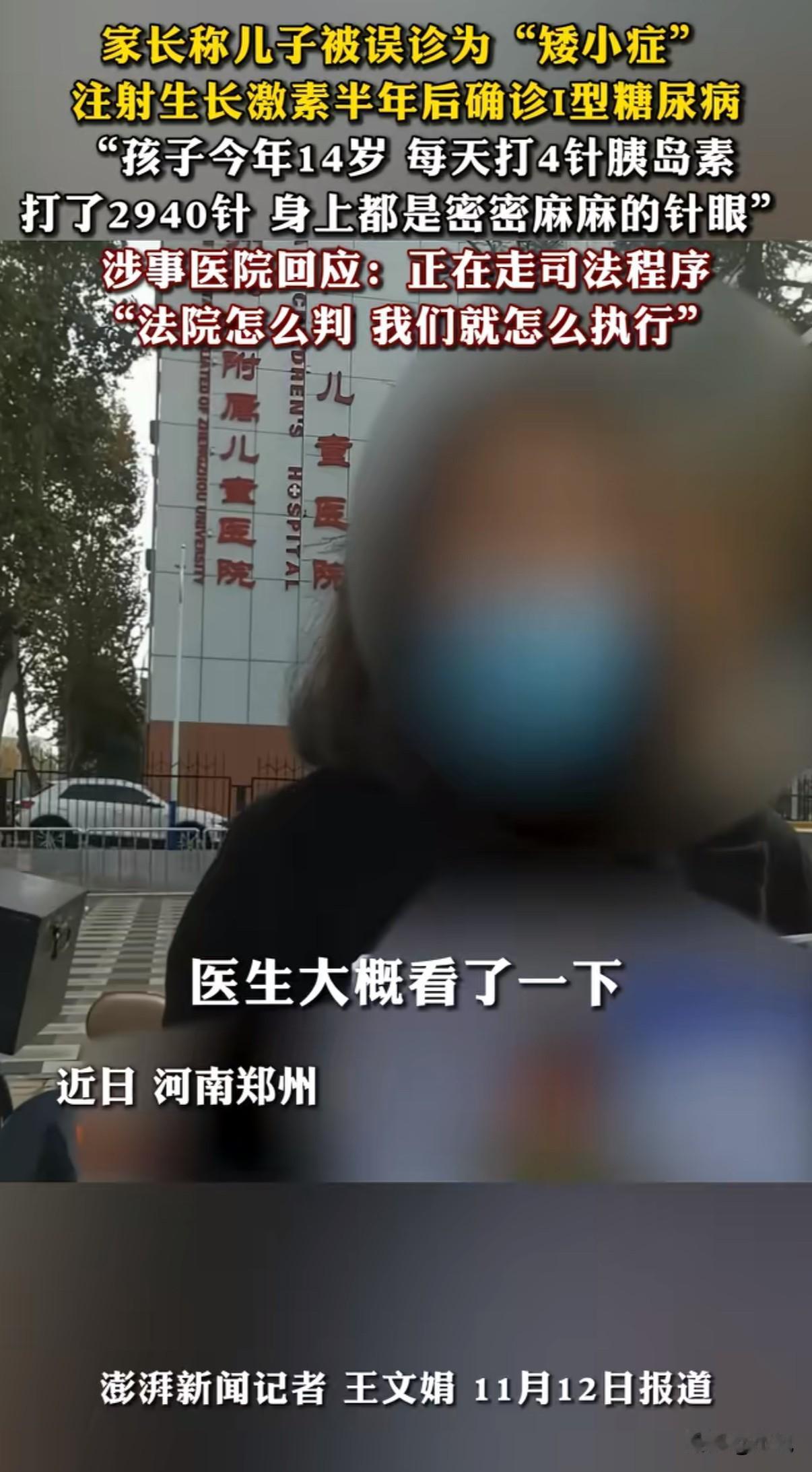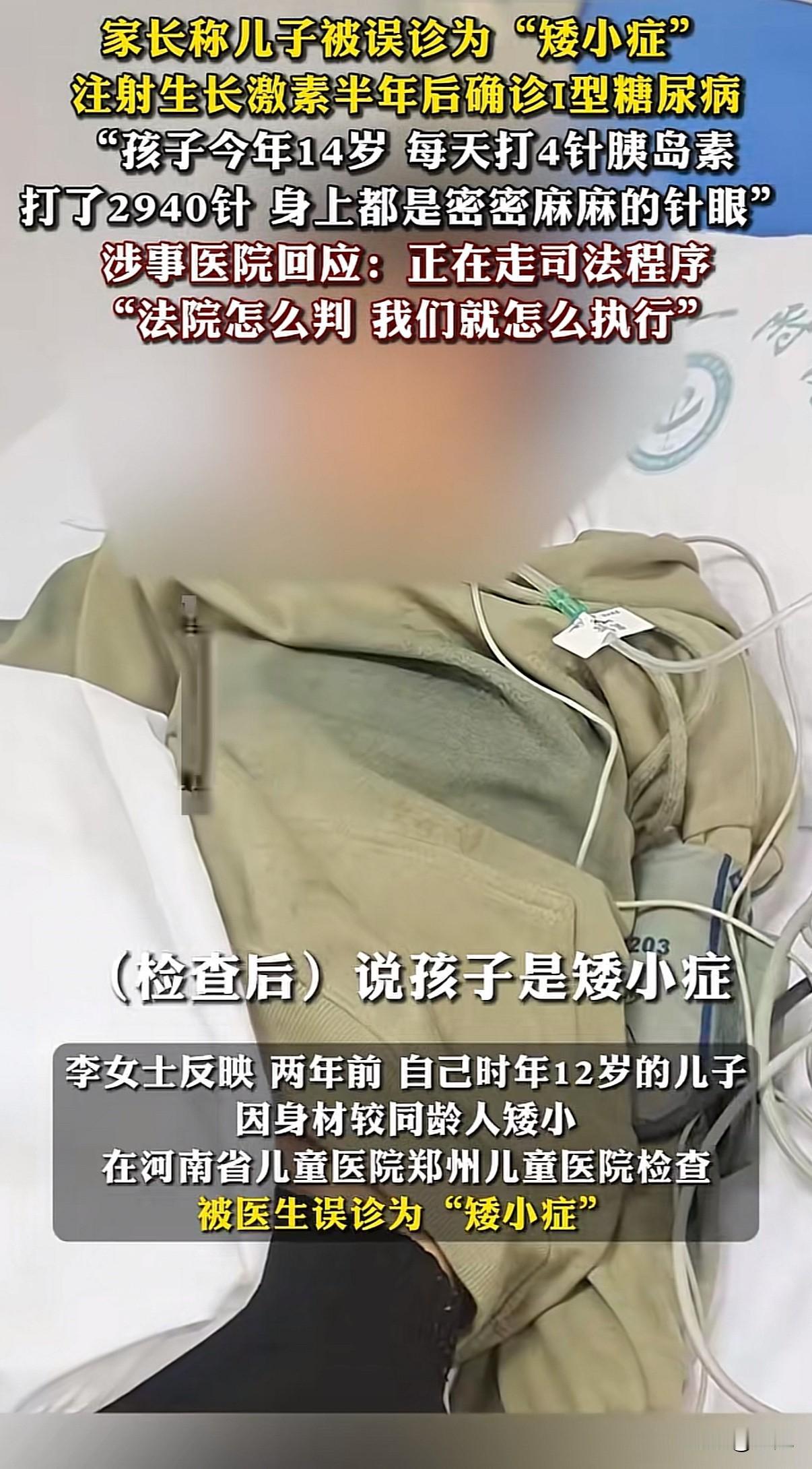 "孩子打完这些针就能长高了吧?" "肯定有效果,很多孩子都在用。" 两年后,这个对话成了这个家庭最痛心的回忆。12岁男孩因身高偏矮,在河南省儿童医院被诊断为"矮小症"。半年生长激素治疗后,等来的不是理想身高,而是一纸"I型糖尿病"诊断书,终身离不开胰岛素。 孩子妈当时就哭了:"这半年孩子身上密密麻麻的针眼,现在每天还要打胰岛素,到底图什么?" 司法鉴定写得明白:"矮小症"是误诊。医院没查清楚就用药,还没监测血糖,错得明显。 但有个细节让人想不通:医学上每天打1针,半年顶多180针。可家属记录了2940针,平均每天16针。这个数字背后,是不是有什么我们不知道的内情? 更让人深思的是,生长激素不是普通维生素。它对身体是种强力干预,用在本身就敏感的孩子身上,就像火上浇油。 现在医院说要走法律程序,可再多的赔偿,能换回孩子的健康吗? 每次看到这样的医疗悲剧,就在想:我们到底需要怎样的医疗?是流水线式的看病,还是真正为患者着想的诊疗?