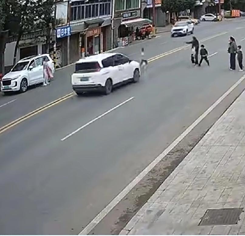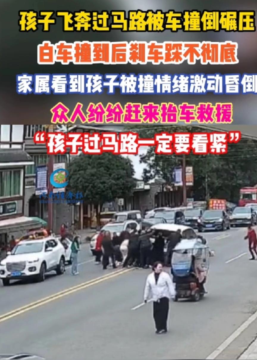 11月12日,四川发生了一起车祸,孩子妈当场昏倒。 视频显示,在一条街道上,孩子妈将车停在路边,下车后准备拿一件衣服。谁知她的穿黄衣服的孩子,看见马路对面,有两个各带一个小孩的成人,似乎在向他打招呼,便奔跑过去。 黄衣孩子没注意观察,被一辆开得很快的白色轿车,撞倒在地上,并且拖行了一段距离。 孩子妈拿了衣服,扭头一看,孩子已在马路上奔跑。这太危险了,她跑过去想把孩子追回来,但是晚了,目睹孩子被车撞倒拖行。妈妈快急疯了,她拦住了一辆车,请求救援,然后昏倒在地。路人见状,纷纷施以援手,把车抬起,孩子从车底下救了出来。但愿孩子没事。 这段视频暴露出两个问题,一是行人在机动车道任意行走,二是机动车看到路上有行人也不减速,事故就这样发生了。 事故教训深刻,不管是行人还是司机,安全意识万万不可粗心大意。 孩子被车辆撞倒拖行众人抬车救援 车祸现场
