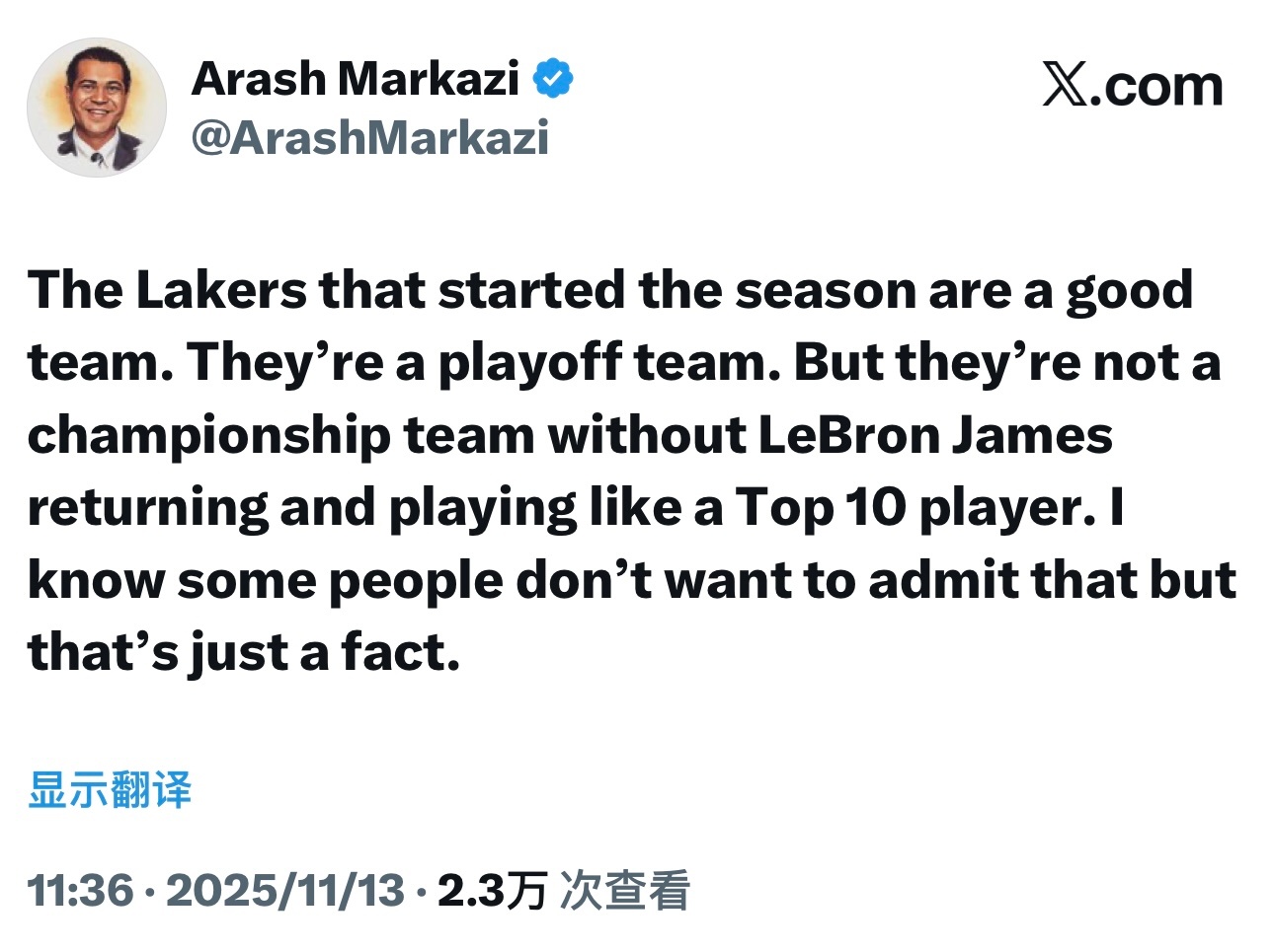 洛杉矶媒体人Arash:“赛季初的湖人是一支不错的球队,能打进季后赛。但除非勒布朗·詹姆斯回归赛场、打出联盟前十级别的表现,否则他们成不了争冠级别球队。我知道有人不愿承认这点,但这就是事实。”