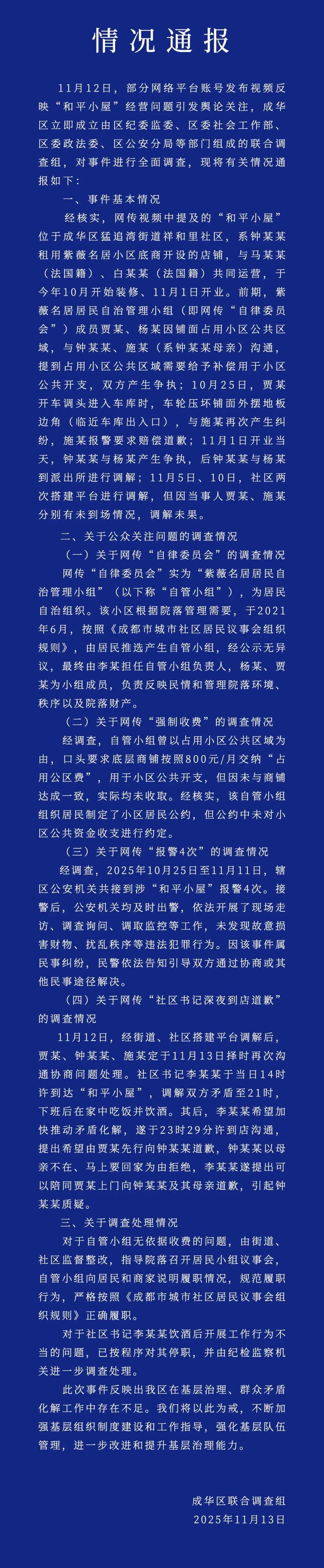 和平小屋的事情得到完美解决。事情的缘由是和平小屋,被自律委员会定性为违建,占用公共空间需要缴纳800块钱一个月。 因为和平小屋并不想交纳这笔费用,于是自律委员会成员在和平小屋挑毛病,不让他开门。各种毛病各种干扰,曾经报警过四次都没有得到解决。 这次曝光于网络事情很快就得到完美的解决。 自律委员会是该小区的业主成员。