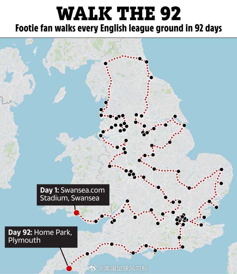 【走遍英格兰92队主场】一位54岁的英国球迷,维金斯,花了92天时间,用双脚走遍了整个英格兰,造访“英超+英冠+英甲+英乙”合共92个主场,具体路线请看图2,起点在斯旺西,终点则设在普利茅斯。
