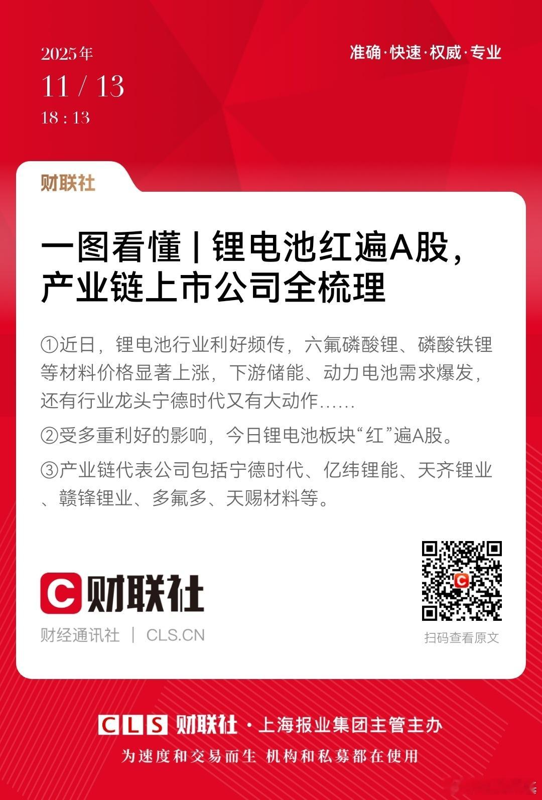 📌一图看懂 | 锂电池红遍A股,产业链上市公司全梳理财联社 2025-11-13 18:13①近日,锂电池行业利好频传,六氟磷酸锂、磷酸铁锂等材料价格显著上涨,下游储能、动力电池需求爆发,还有行业龙头宁德时代又有大动作……②受多重利好的影响,今日锂电池板块“红”遍A股。③产业链代表公司包括宁德时代、亿纬锂能、天齐锂业、赣锋锂业、多氟多、天赐材料等。①近日,锂电池行业利好频传,六氟磷酸锂、磷酸铁锂等材料价格显著上涨,下游储能、动力电池需求爆发,还有行业龙头宁德时代又有大动作……②受多重利好的影响,今日锂电池板块“红”遍A股。③产业链代表公司包括宁德时代、亿纬锂能、天齐锂业、赣锋锂业、多氟多、天赐材料等。