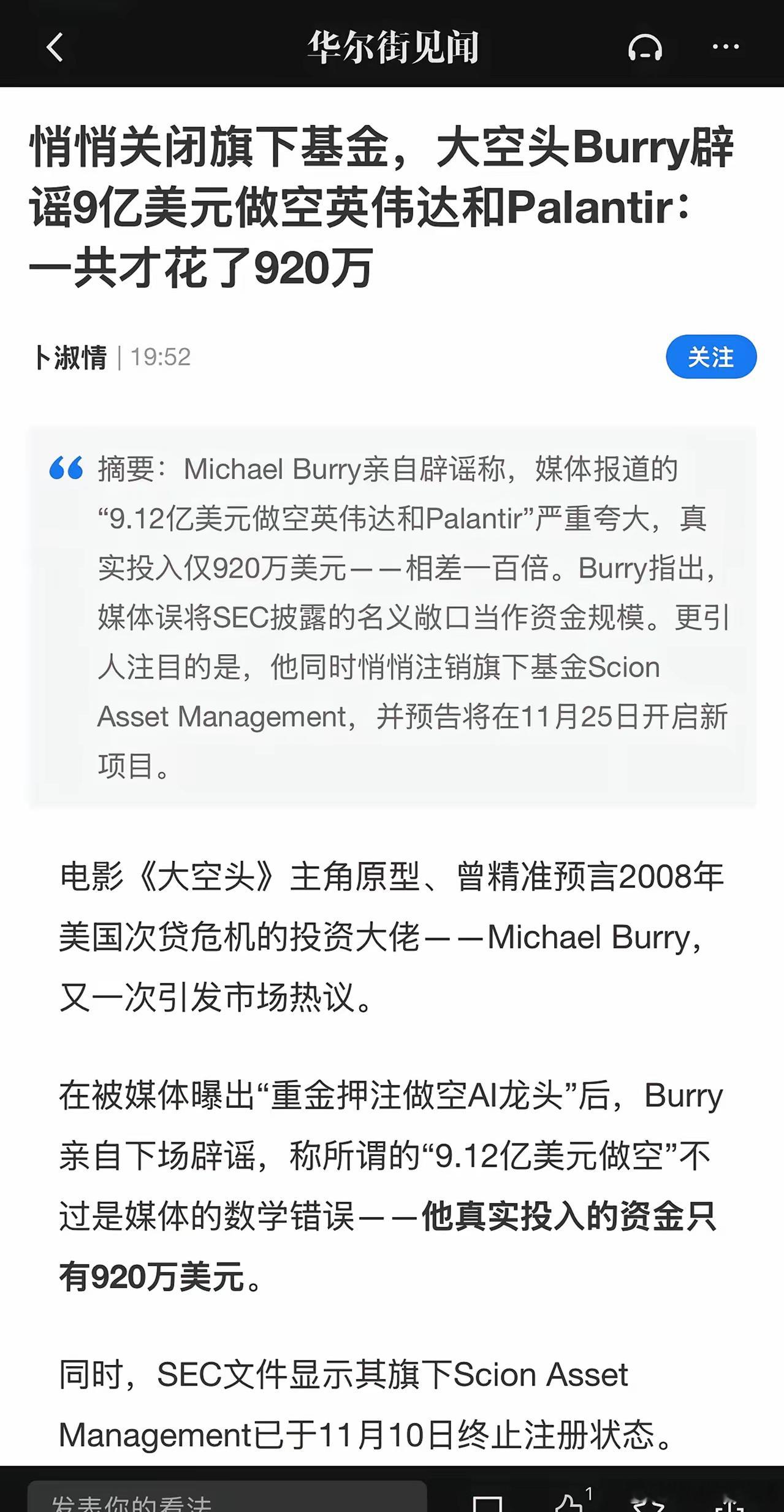 所谓的“大空头”做空英伟达,竟然是一个乌龙,这美国的小作文比中国还厉害,足足夸大了90倍!AI这才刚刚开始,很多人就说有泡沫了,从AI转去投电力、煤炭、能源了,真是服了!AI的算力建设、数据中心,才刚刚开始,美国缺电,中国根本不缺,所以我真是搞不懂有些人的逻辑,重新回到旧生产力了,仿佛AI已经到头了!半导体、芯片、AI的中美竞争刚刚拉开帷幕,巨头们还在摩拳擦掌呢,有些人就开始看空做空了。要知道软银套现400亿从英伟达走,不是因为看空AI基建,而是他更看好OpenAI,他押注到AI应用上,这才是AI真正改变人类的地方!美国资本在投资软件,包括OpenAI、甲骨文、博通,中国市场却基本上抛弃了这条主线,我也是服了!中国是以制造业立国的,所以AI与实体产业的结合,才更具增长潜力,很多新质生产力公司利润已经有几亿甚至几十亿了,这些公司才真正的是软硬结合的AI智能体公司!