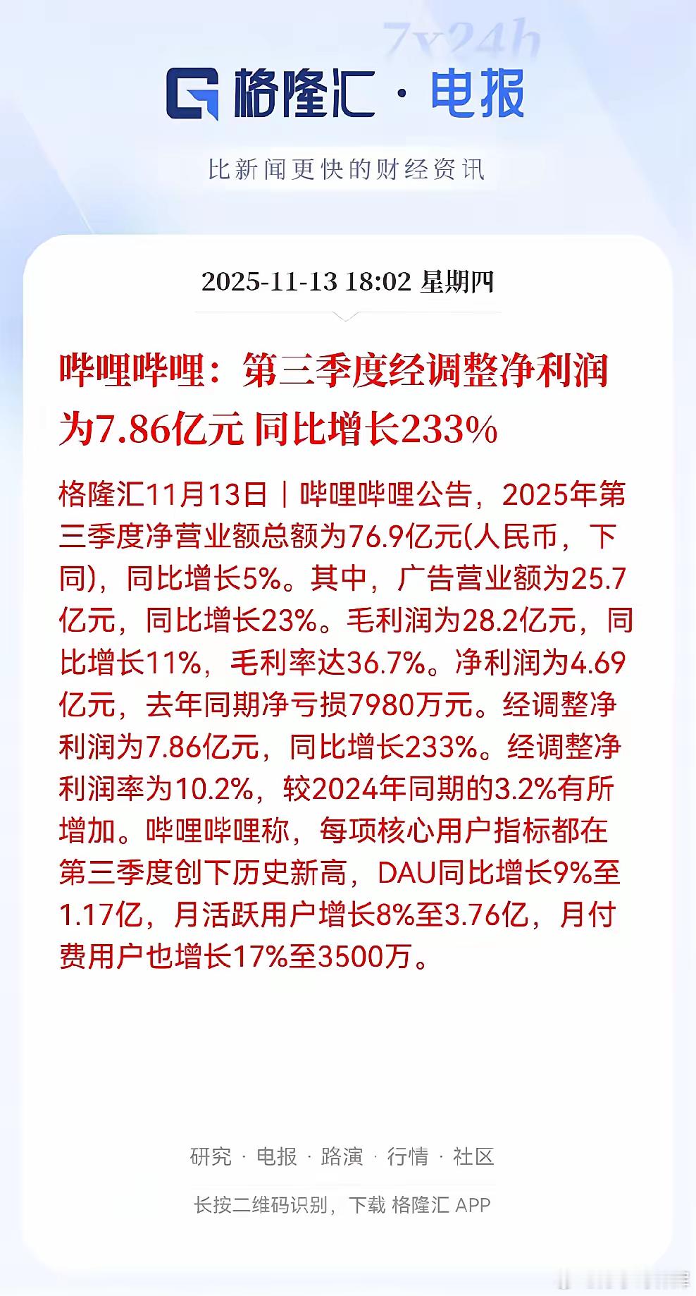 B站也算好起来了!去年这会儿还亏着小八千万,今年直接赚了4.69亿,上演绝地翻盘。更厉害的是,调整后的利润暴涨233%,相当于每收入100块,能净赚10块,比去年每100块只赚3块,强太多了啊!用户方面更是全面开花,日活破1.17亿,月活冲到3.76亿,差不多每四个中国人里就有一个用B站。付费用户冲到3500万,说明大家越来越愿意为爱买单。广告收入能涨23%,证明平台商业价值,被品牌方认可了!现在B站算是摸到门路了,既保持社区调性又把钱赚了,这家二次元起家的网站,终于把用爱发电,变成了用爱生财!