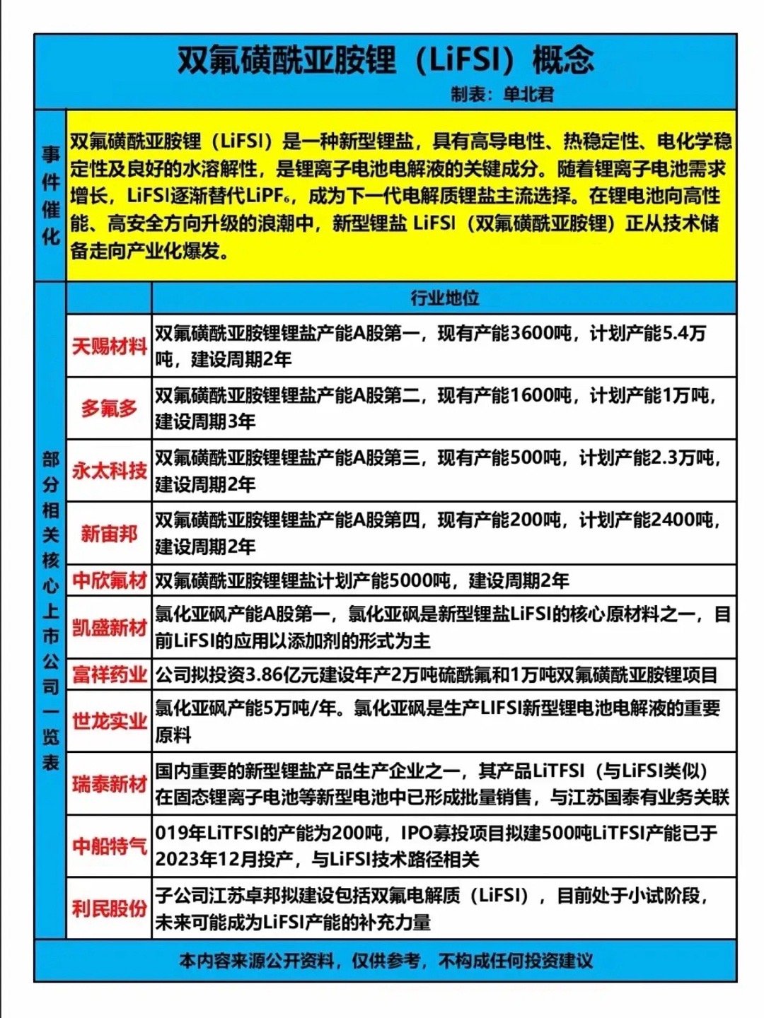 新型锂盐:双氟磺酰亚胺锂(LiFSI)概念!双氟磺酰亚胺(LiFSI)是一种新型锂盐,具有高导电性、热稳定性、电化学稳定性及良好的水溶解性,是锂离子电池电解液的关键成分。随着锂离子电池需求增长,LiFSI逐渐替代LiPF6,成为下一代电解质锂盐主流选择。