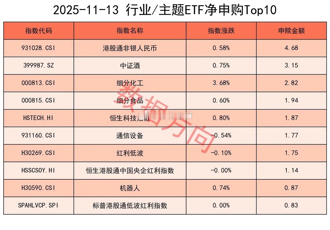 上交所ETF净赎回20亿您身边的数据大师,专业分享期指、ETF数据,欢迎关注交流~11月13日星期四,大盘全天震荡上行,锂电强势领涨。上证指数涨幅0.73%,日内摸高至4030点,再次创出十年新高,上交所ETF合计净赎回19.29亿元。宽指上证50指数(3.91亿)、中证1000指数(3.57亿)、中证500指数(3.06亿)、中证A50指数(0.75亿)、上证180指数(0.07亿),分别获得小幅净申购。沪深300指数(-10.44亿),净赎回超10亿。科创50指数(-4.9亿)、中证A500指数(-2.62亿)、上证指数(-1.37亿)、科创100指数(-0.6亿)、科创创业50指数(-0.33亿),分别被小幅净赎回。行业和主题 港股通非银人民币指数(4.68亿),进入申购榜;证券公司指数(-2.61亿)进入赎回榜。中证酒指数(3.15亿)、细分食品指数(1.94亿),一起进入申购榜;红利低波指数(1.75亿)、恒生港股通中国央企红利指数(1.14亿)、标普港股通低波红利指数(0.83亿),一起进入申购榜。其他进入申购榜的还有:细分化工指数(2.82亿)、恒生科技指数(1.87亿)、通信设备指数(1.77亿)、机器人指数(0.87亿)。有色金属指数(-5.62亿)、中证煤炭指数(-2.4亿)、稀土产业指数(-1.22亿),一起进入赎回榜。半导体指数(-2.1亿)、科创芯片指数(-1.8亿),一起进入赎回榜。CS电池指数(-1.95亿)、中证新能指数(-1.47亿),一起进入赎回榜。其他进入赎回榜的还有:科创新药指数(-1.41亿)、中证军工指数(-1.31亿)。
