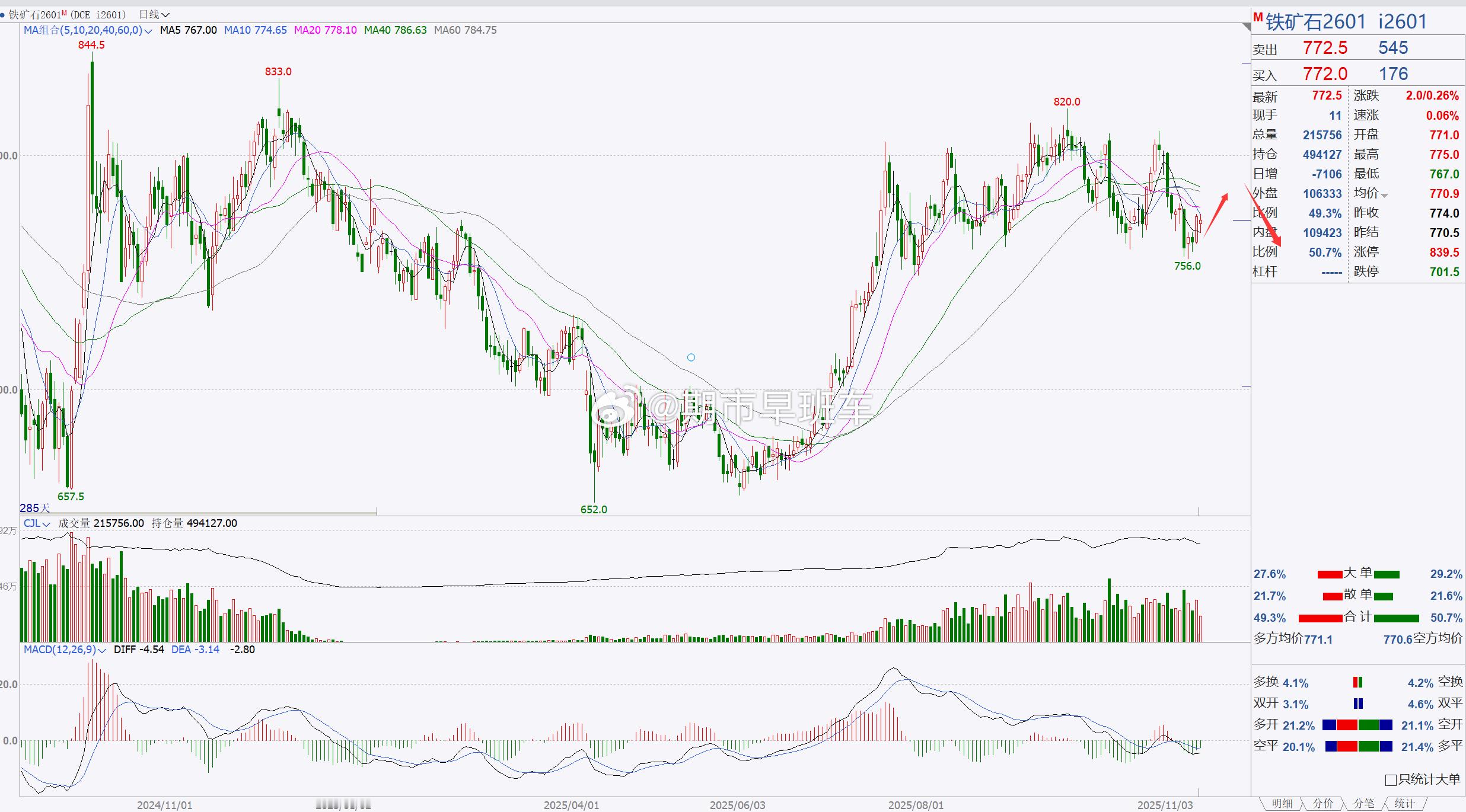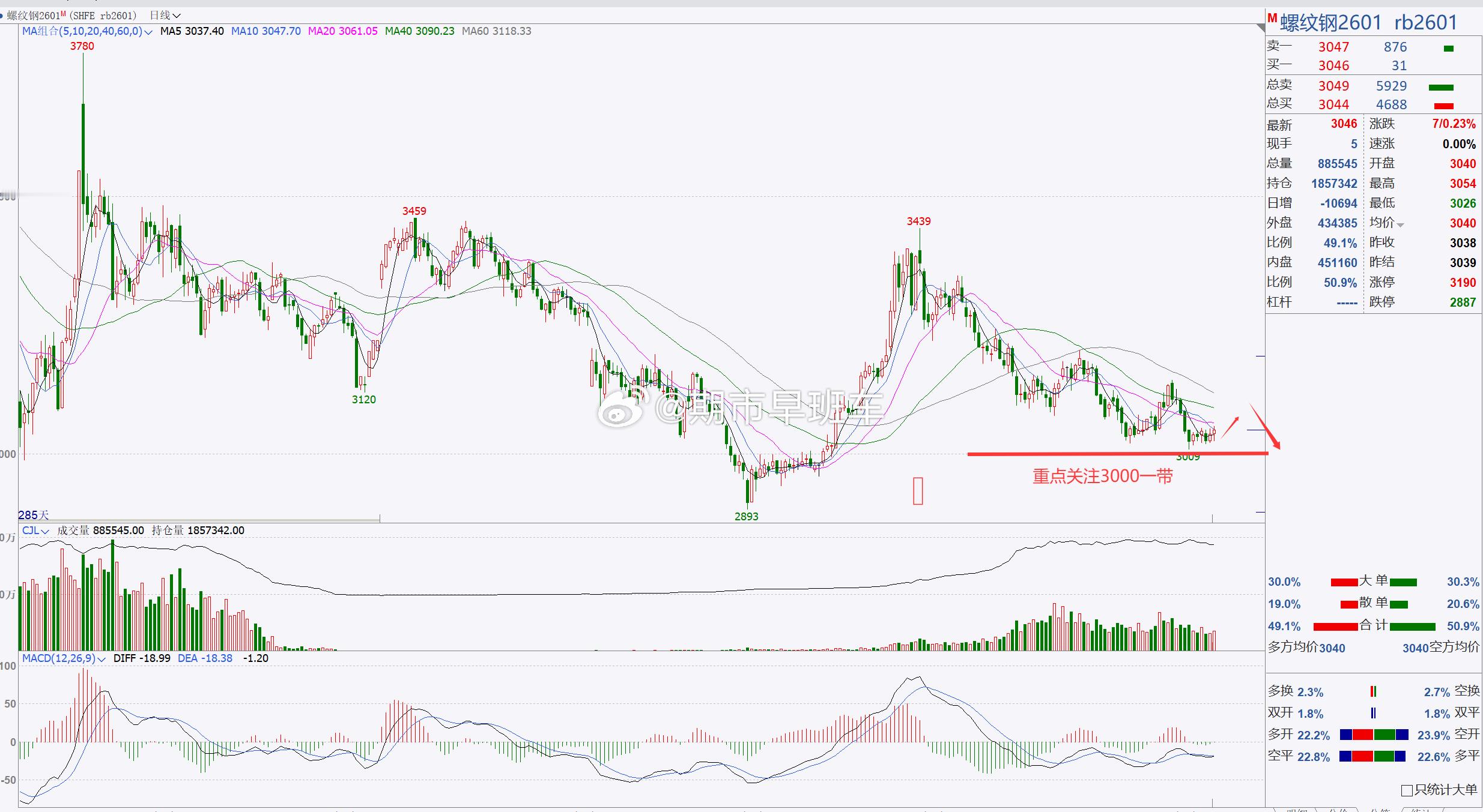 1、【焦煤2601】焦煤低位横盘,短线跟进!焦煤回踩后,目前处于低位横盘,后市重点关注1200一带,若此位置跌破,焦煤还有回踩调整预期,建议短线跟进;例如空关注1240—1250附近,下方先关注1180附近;多关注1180附近再择机考虑介入;(建议仅供参考,具体操作以开盘点位实时跟进,据此操作风险自担)2、【螺纹2601】螺纹短线跟进,重点关注3000整数一带!螺纹回踩后,目前处于低位横盘调整,但是3000整数一带未能跌破,后市我们重点关注此位置,未能突破,建议短线跟进;例如3020—3000附近,上方先关注3100附近空关注3000附近再择机考虑介入;(建议仅供参考,具体操作以开盘点位实时跟进,据此操作风险自担)3、【铁矿石2601】铁矿石短线跟进!铁矿石至回踩后,目前伴随着短期反弹调整,但是整体行情表现一般,后市我们短线跟进即可,稳健者建议先观望;例如多关注765—762附近,上方先关注788—790附近;空关注788—790附近再择机考虑介入;(建议仅供参考,具体操作以开盘点位实时跟进,据此操作风险自担)