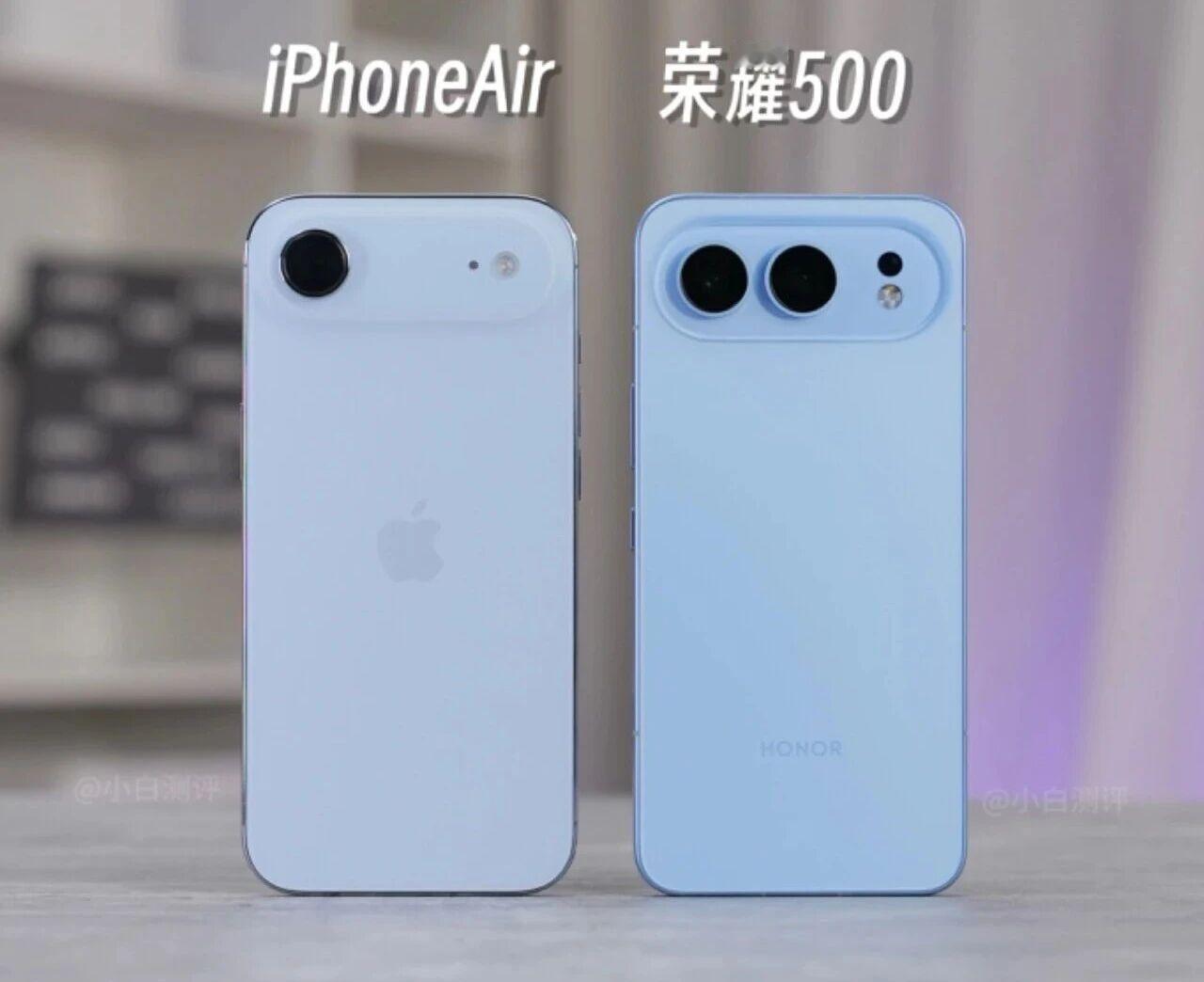 有没有一种可能,iPhone Air的唯一目标就是薄呢?荣耀500其实还是蛮水桶的,这两个的定位不是一样的,只是背部有点像罢了!荣耀手机 现在的手机其实已经玩的差不多了,所以有什么外观设计也不足为奇,当然交叉点也越来越多,三星S10系列也曾经是这样的设计,当时很多网友吐槽,说是断掌设计,非常不好看,可是十年过去了,三星S10依旧是经典,所以设计就那么回事,慢慢的也就顺眼了。 其实目前国内手机还是不敢轻易在极致轻薄上冒险,大家对于iPhone的宽容度蛮高,不代表对于国产手机也这样,如果厚度下降了,续航下降了,不知道网友能不能接受,所以即便是华为mate 70 Air ,也没有在续航上妥协,所以还需要一点时间吧!