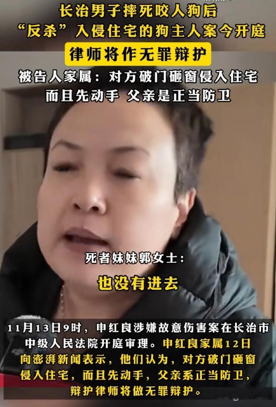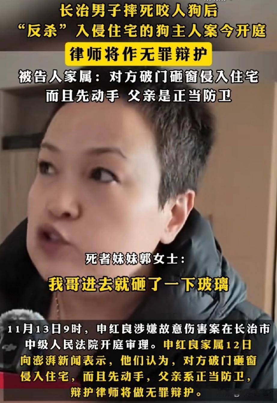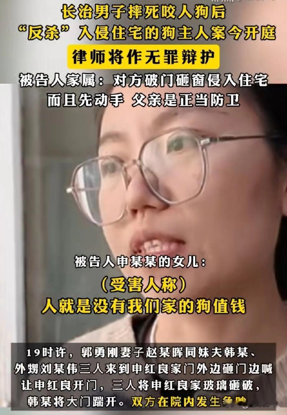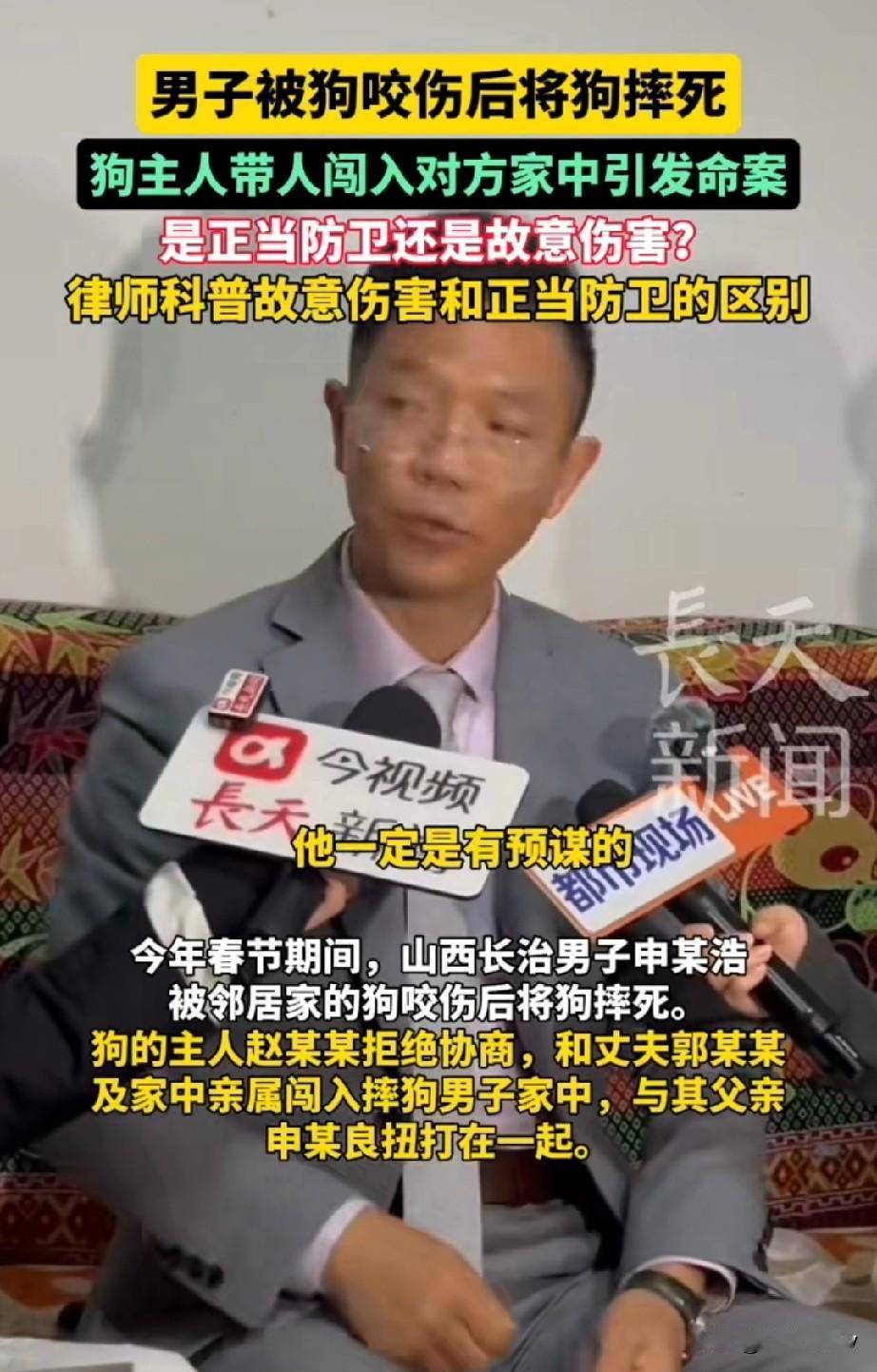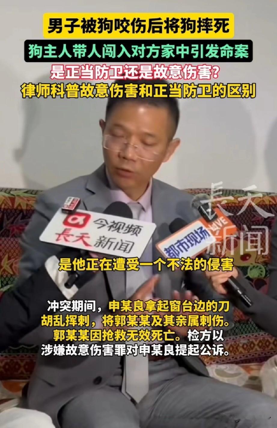 山西长治狗咬人引发狗主人死亡案,死者家属哭诉杀人者心太狠,网友一边倒的支持属于正当防卫,这回山西法官该怎么判呢?我估计山西法官压力很大 当事人申某是在自己家被狗主人郭家一伙9个人砸窗玻璃后闯入家里群殴申某,申某顺手拿起窗台上的一把刀导致郭某大动脉失血过多休克直至死亡。(消息来源:长天新闻) 说实话郭某纠集9个人冲入申某家本来就不应该,而且当天摔死狗的申某登门协商被拒绝,而当天夜里就打上门,确实有点不应该 是任何一个人被狗咬伤都会给狗一个教训,狗敢咬我,我就敢打你狗,不就是一条狗而已嘛。再说了,养狗不牵绳又咬伤人,这本来就是养狗者的责任。今天不被受害者弄死,早晚也会被其他人弄死。 申某登门协商,狗主人既然事已至此那就协商赔偿就完了,人家赔你狗钱,你赔人家医疗费仅此而已。你却拒绝协商,晚上伙同一帮人持械打上门,这明显就是“你打死我的狗,我打死你的人”为目的。但他们就是没搞清楚人命与狗命的区别! 可遗憾的是被老申来了一个反杀导致一死三伤,你说何必呢?小不忍则乱大谋,乘匹夫之勇只会两败俱伤,越搞越糟! 至于申某行为是否属于正当防卫?但有律师表示申某面临几个人围殴时做出的行为是正当防卫,而绝大多数网友也支持这种说法。 借此事件我们更应该让所有养狗爱好者以此为鉴,养狗没人反对,但不牵绳乱跑被致死或者不牵绳咬伤他人者就该付法律责任,作为狗主人既要文明养狗,又要遵守公德。