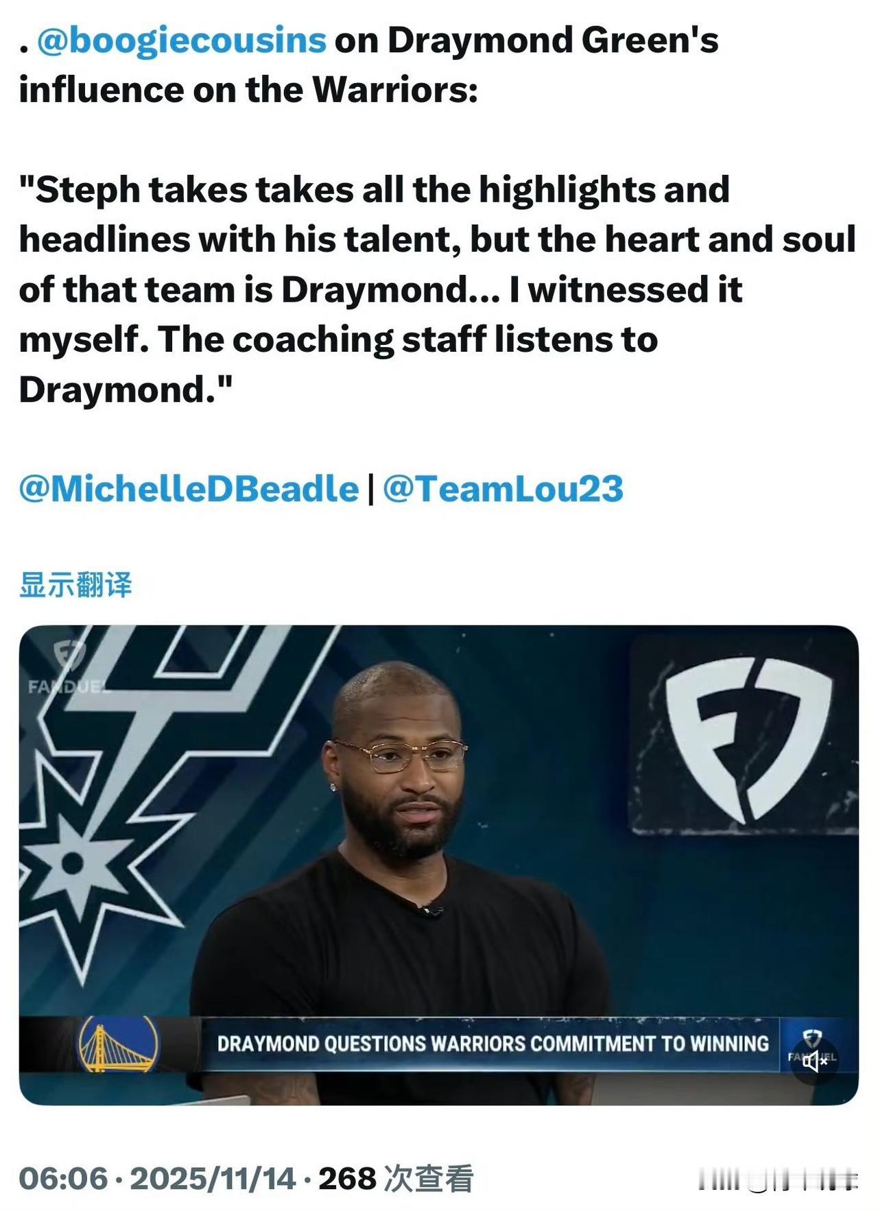 考辛斯真敢说啊! 前勇士队球员考辛斯在一档节目中谈到了格林对勇士队的影响力,他认为格林才是球队真正的灵魂:“库里是包揽了所有高光时刻和头版头条,但这支球队真正的核心和灵魂是格林,这是我亲眼所见,连教练组都会听他的意见。” 耳听为虚、眼见为实,考辛斯为勇士队效力过,说出来的话非常具有可信度。此外,格林作为一个防守、组织型内线,能够在职业生涯末期让勇士队心甘情愿的奉上续约合同,这说明他有着极强的不可替代性。格林是勇士队的防守核心,是球队更衣室领袖,是队友的头号保镖,是教练组最好的传话筒,正如考辛斯说的那样,格林才是勇士队的灵魂。