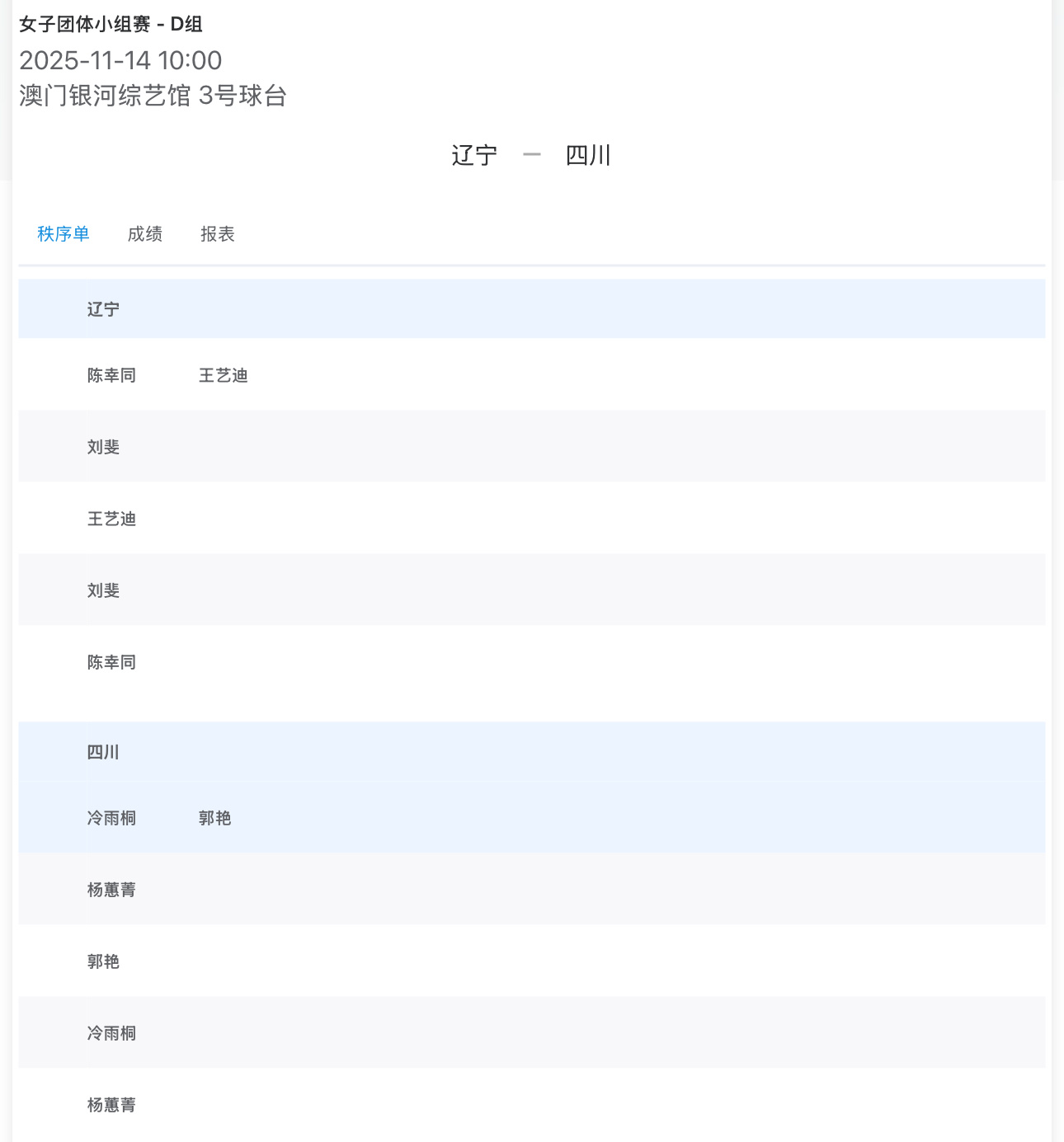第十五届全运会乒乓球女子团体小组赛 - D组2025-11-14 10:00 3号球台【辽宁vs四川】陈幸同/王艺迪vs冷雨桐/郭艳刘斐vs杨蕙菁王艺迪vs郭艳刘斐vs冷雨桐陈幸同vs杨蕙菁