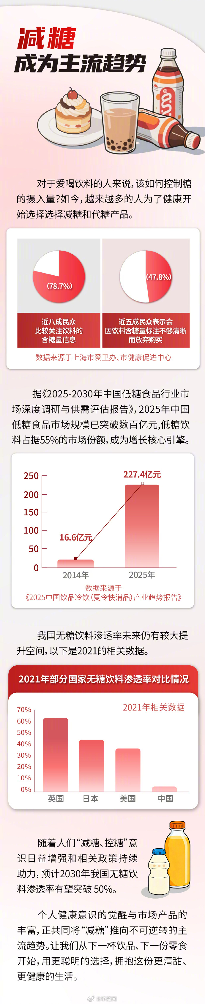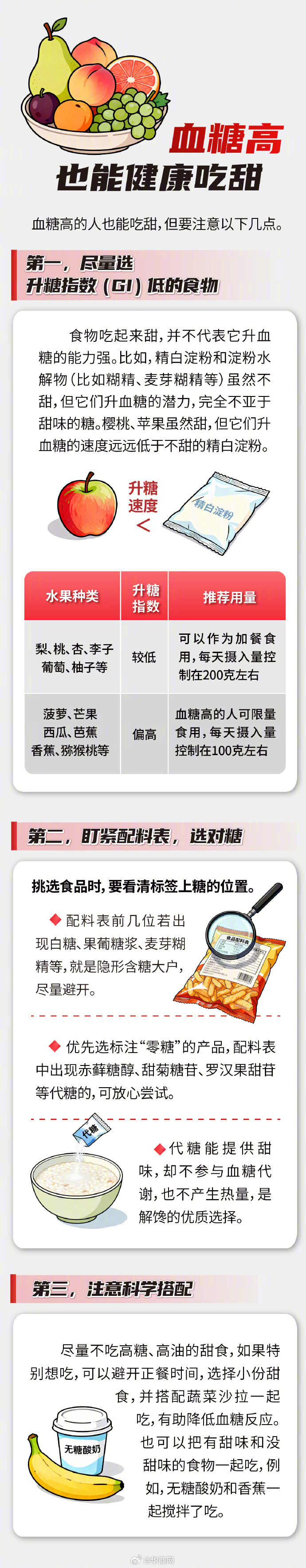 【】 11月14日是世界防治糖尿病日,中国疾病预防控制中心慢病中心在Military Medical Research发布的最新报告显示,我国糖尿病患者人数达2.33亿,相当于每6个人里就有1个患病者。减糖早已成为健康生活的主流趋势,而对血糖高的人群来说,“戒甜”并非唯一选择。许多人确诊糖尿病后就不敢碰甜味食物,这其实是误解。能不能吃甜,核心看血糖上升的快慢与高低,掌握方法就能健康解馋。第一,尽量选升糖指数(GI)低的食物,避开高 GI 隐形糖来源;第二,学会看食品配料表,避开白糖、果葡糖浆等靠前的含糖成分,优先选含代糖的合规产品;第三,注意科学搭配,避开正餐时间吃小份甜食,搭配蔬菜沙拉等膳食纤维丰富的食物,有助于均衡饮食。