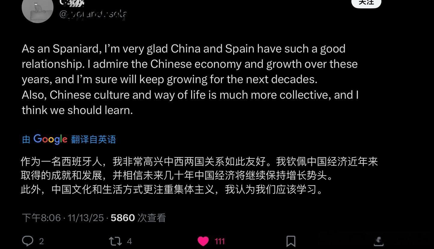 昨天写了篇Po文,在西班牙网友中成了爆款。内容是关于普通中国民众对西班牙的印象,相比其他欧洲国家,普遍更为积极和友好。这种态度,与西班牙近年来务实的外交风格、较少居高临下的说教姿态,以及积极推动对华贸易和人文交流密不可分。评论区里,不少西班牙网友也留下了热情友好的回应。有人提到欧洲对华签证政策偏严,希望放宽限制,欢迎更多中国游客到访;有人称赞中国人勤奋守法,认为值得学习;还有人回顾起古代海上丝绸之路连接两国的历史,主张加强中西合作,不必囿于美欧框架的束缚;有人主动反驳评论区种族歧视的言论,认为西班牙的中国移民遵纪守法,为当地发展作出了巨大贡献。当然也有不和谐的声音,但整体而言,西班牙确实是欧洲国家中,对华态度相对更友善的一个。我对西班牙的印象一直很好。记得在塞维利亚旅行时,我曾因肾结石发作被救护车送往医院。在等车的时候,一位当地阿姨和两个年轻人一直搂着我的肩膀安慰我,虽语言不通,但让人倍感温暖。他们目送我上了救护车才离开。到了医院,急诊台叫到我名字时,我还躺在担架上,是两位西班牙大妈主动帮我朋友一起把我推进急诊室。接诊的医生也格外温和耐心,一直安抚我的情绪。在巴塞罗那问路,遛狗的情侣热情地带我走到住处,哪怕她们原本散步的方向完全相反;在萨拉格萨拜访朋友时,当地人也热情地邀请我们一起喝酒看球。回想我几乎走遍的欧洲各国,西班牙确实是其中尤为友善的一站。如今,中西关系稳步推进,中国的免签政策也为更多西班牙民众了解中国提供了便利——这些都是积极而有力的信号。