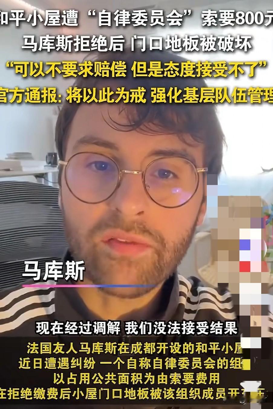 这件事换谁都觉得替外国友人心寒,当初的“抗日战争历史照片的捐赠者”马库斯,自来到中国后,便喜欢上了成都这块有着风土人情,美食境地的宝地。 甚至和钟灏松、白士杰共同创办的公益展馆,位于成都市成华区,2025年11月1日开放,集中展示法国摄影师罗杰·皮埃尔劳伦斯拍摄的抗战历史照片。 可是建成后,突然被一群来自“自律委员会”的人索要800块,被拒绝后多次以占用了公共设施,占道等等理由,对和平小屋进行破坏和阻挠。 还被人用车压坏门口的地板,被告诫让他们要么交钱,要么离开,这一行为深深刺痛马库斯的心。当初被中国人的热情感染而留下,如今他实在想不明白,为什么会这样对他。 很多各地都网友开始纷纷喊话,马库斯离开四川吧,别的地方欢迎你。事后有关部门协调下,马库斯表示不接受赔偿,只是对于要钱的态度,和对他们“和平小屋”做的这些破坏行为,他始终不能接受。 成都这次还真是有点打脸啊,觉得经营占地,你出具相关合情合理的证明,依法进行规劝啊,给别人搞“小鞋”穿,整得自己小肚鸡肠一样。 (图片来自网络视频)