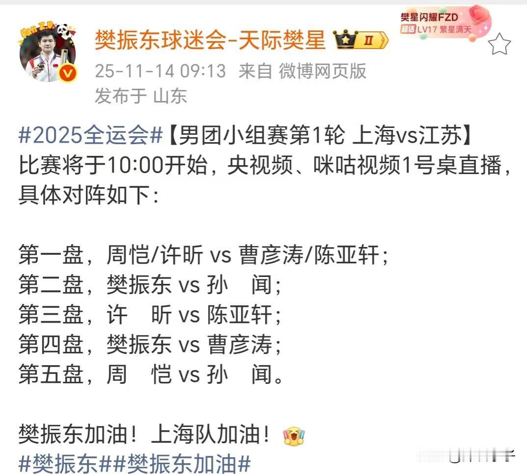 今天上海队对阵江苏队对阵表来了! 今天的排兵布阵是:樊振东一单第二第四盘,许昕二单和周恺双打。 今天赵子豪休息。 今天东哥上场保持手感,当然希望三盘就解决战斗,让东哥保存体力,明天半决赛打爆一切! 期待上海队全运会乒乓球团体首胜。 上海队加油! 全运会 樊振东 许昕