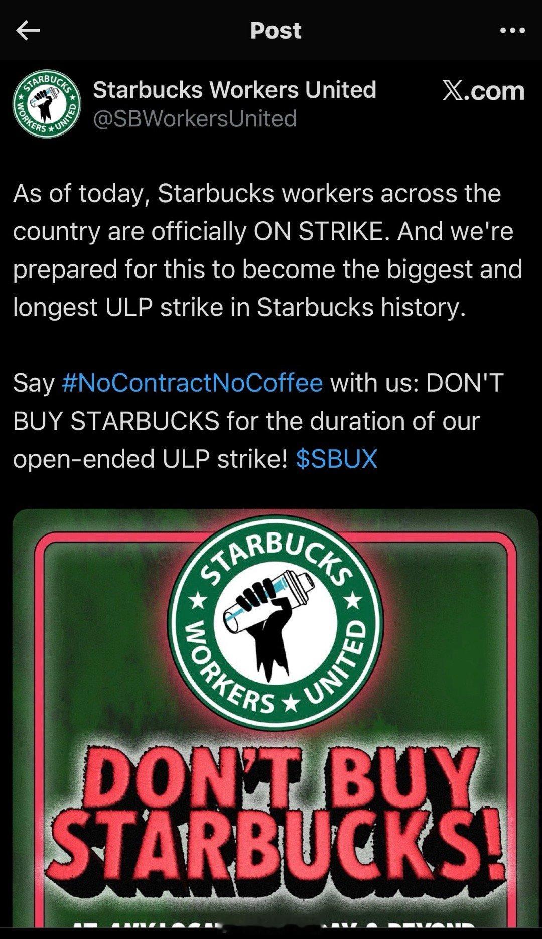 星巴克美国员工发起”红杯叛乱”大罢工:千余名咖啡师走出工作岗位超过1000名星巴克工会员工于当地时间周四在全美65家门店发起罢工,抗议劳资谈判缺乏进展 。罢工时间选在星巴克一年中最繁忙的促销日之一——“红杯日”(Red Cup Day),工会将此次行动称为”红杯叛乱”(Red Cup Rebellion)。此次罢工涉及45个城市的门店,包括纽约、费城、明尼阿波利斯、圣地亚哥、圣路易斯、达拉斯、哥伦布以及星巴克总部所在地西雅图 。工会表示,这是一场没有设定结束日期的开放式罢工,如果星巴克不与工会达成合同协议,将有更多门店准备加入。星巴克工会自2021年在纽约州布法罗的一家门店首次成功组建以来,目前代表约550家门店的9500名员工,占星巴克咖啡师劳动力的4% 。罢工员工提出三大核心诉求:1. **提高薪资待遇** - 工会表示,在约33个州起薪为每小时15.25美元, 高管们年薪数百万美元,公司在6月份花费8100万美元在拉斯维加斯为14000名店铺经理和区域领导举办会议 。1. **改善人员配置** - 员工反映门店长期人手不足,导致顾客等待时间过长,而许多咖啡师无法达到获得福利所需的每周20小时工作门槛。1. **解决劳工纠纷** - 工会已向国家劳动关系委员会提交超过1000起不公平劳工实践指控,包括125起发生在2025年1月以来的案件 。双方的合同谈判于2024年4月开始,但在12月破裂。今年4月,工会代表以压倒性票数否决了星巴克的合同提案,因为该提案未能在合同第一年改善工资或福利,也未就长期人手不足问题提出建议 。这次罢工将矛头直指公司高管与基层员工之间的巨大薪酬差距。根据AFL-CIO工会联合会的数据,星巴克CEO Niccol在2024年的薪酬总额超过9500万美元,是公司员工平均工资的6666倍 。这一数字成为全美500家最大上市公司中CEO与员工薪酬差距最大的案例。工会指出,完成一份公平的工会合同所需成本,将低于星巴克平均一天的销售额,也低于Niccol在2024年工作四个月的9600万美元薪酬 。星巴克强调绝大多数美国门店周四将照常营业。这家咖啡巨头在美国拥有10000家直营门店,以及7000家位于杂货店和机场等地的特许经营店 。截至东部时间周四中午,星巴克表示其直营店销售预期达到或超过目标,并称”这一天开局非常好” 。公司发言人Jaci Anderson表示,星巴克对工会投票授权罢工感到失望,并称公司仍准备好进行谈判。Niccol此前对CBS表示,该公司在行业内拥有”最好的福利”和”最好的工资”,并称工会迄今的要求”不合理” 。