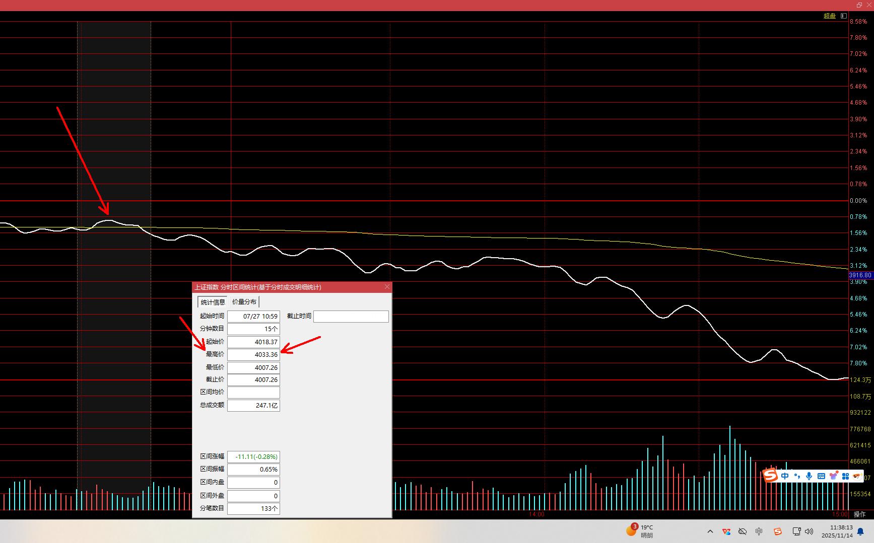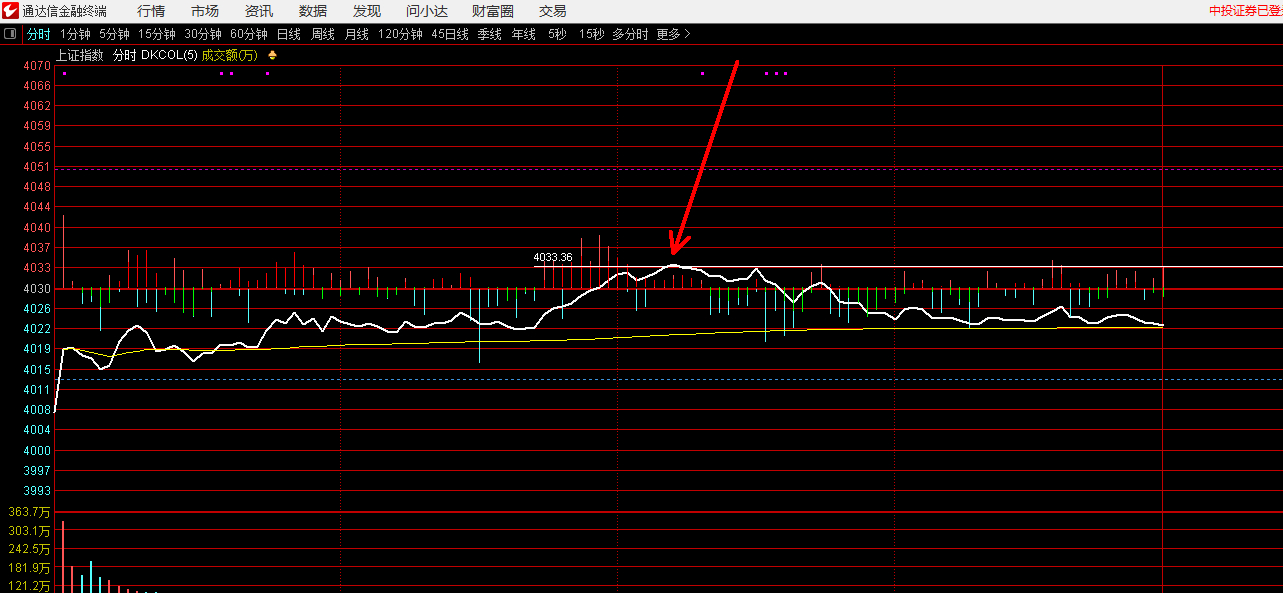 压力点4033.36,时间是2015年7月27日分时,早上最高 4034.08,这里证券不真正启动,就是过不去,就是来回折腾,这里不怕变成熊市,因为指数的20月线已经往上翘了,这是牛市里面才有的特征之一,但这里也只能等,等证券把货拿到位,等包括我这种技术派被市场消灭。
