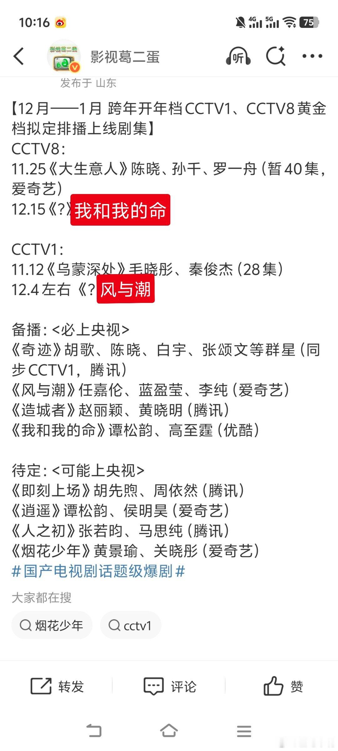 12月央一排播:我来填空!央一:12月上旬《风与潮》任嘉伦 爱奇艺央八:1215《我的山与海》 谭松韵 优酷
