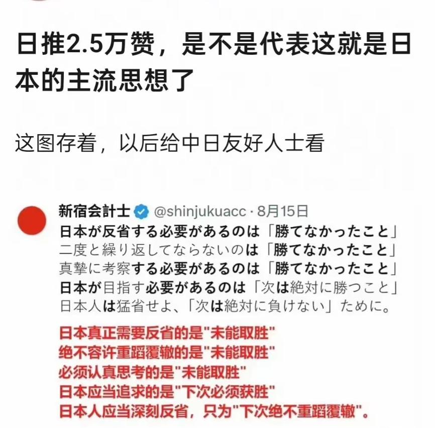 日本新宿会的工作人员发了一条软文,这也许就代表了当下日本人普遍心态。 这个软文仅仅四句话,却收获了一千多条评论和2.5万赞! 只能说,任重而道远。 我们能造出一件比他们好的东西吗?我们需要的是踏踏实实的努力,真正地增强实力,而不是沉迷于嘴炮过瘾,更不是猥猥大郎的吹牛逼,现代战争是实实在在的高科技和工业实力的比拼。 可以看出日本人的赌徒心理有多强,老想着回本。对他们说和平是太仁慈了。他们慕强,只有你比他更强大,才会让他们死了那个不切实际的心。 对此你怎么看?