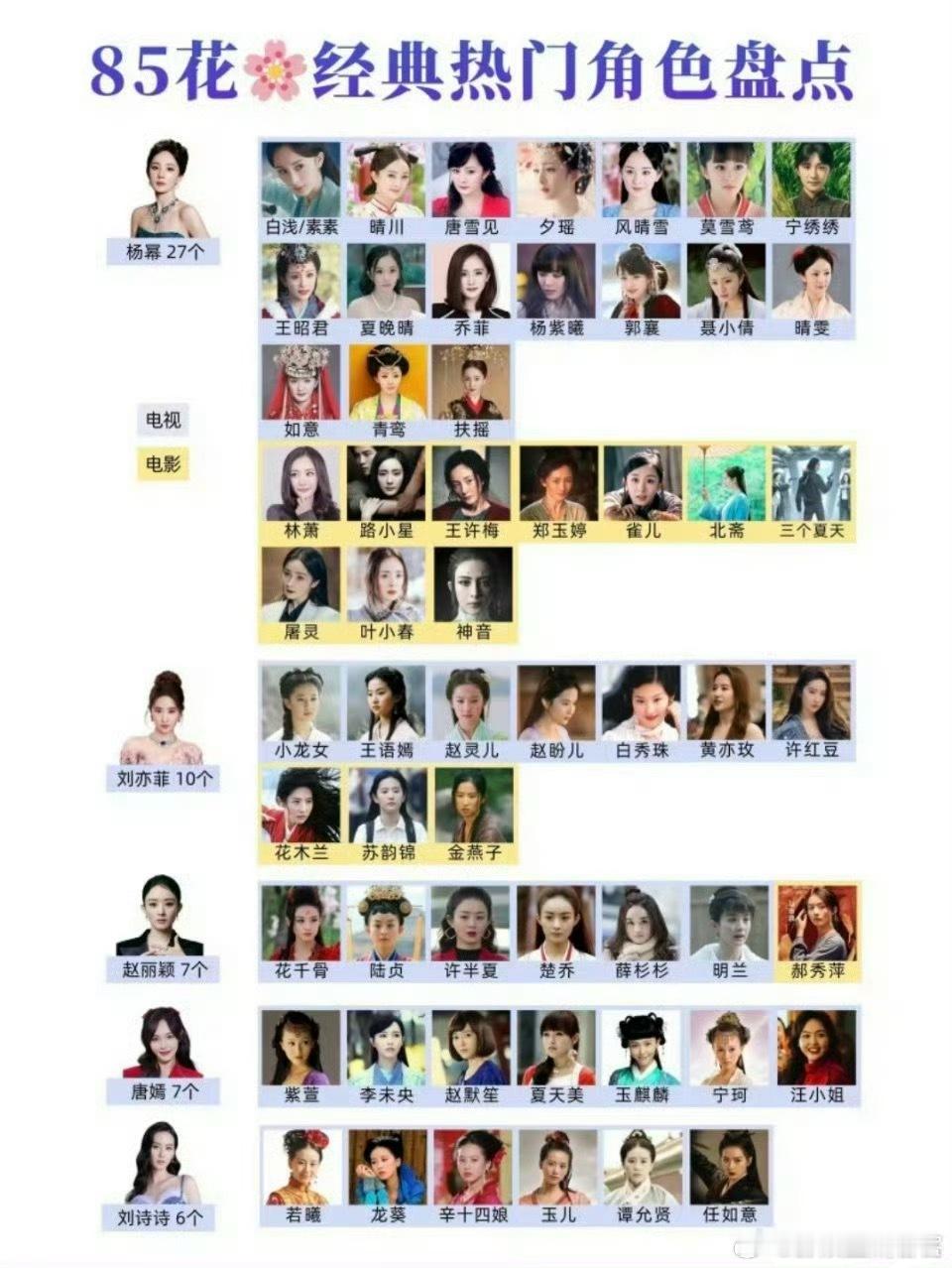 有网友统计了85花/85后刘亦菲,杨幂,赵丽颖,唐嫣,刘诗诗经典角色李涛这个客观吗