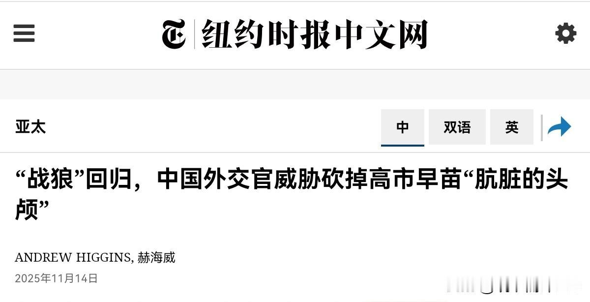 纽约时报点名对我们进行批评!纽约时报声称,中国“战狼”回归,中国外交官威胁砍掉高市早苗“肮脏的头颅”!11月14日,纽约时报表示,被日本新任首相高市早苗的涉台言论激怒的中国发出了一连串的尖刻批评,其中包括一名中国外交官威胁要砍掉这位领导人“肮脏的头颅”。 美媒称,这番“辱骂”突如其来地结束了上任不到一个月的高市与中国之间的“蜜月期”,这也终结了中国一度暂停的“战狼外交”。而现在中国选择以“咄咄逼人”的好斗外交方式对付日本首相。美媒表示,中国的“战狼”外交再次回来了。对于美媒的这一批评,我们怎么看呢?说句不客气的,美媒的这一番论调除了拉偏架,偏见就什么都没有了。 美媒称,中国的“辱骂”突如其来的结束了上任不到一个月的高市与中国之间的“蜜月期”,这完全是胡说八道。似乎在美媒看来,中日之间有所谓的蜜月,中国也不应该回击高市早苗的恶劣言论?但事实是,高市早苗上台以来,中日之间没有任何的蜜月期。在APEC峰会期间,高市早苗与台湾林信义会面的挑衅行为,早就引发我们极大的不满。美媒是看不见吗? 高市早苗自己口无遮拦的胡说八道,是不知道台湾问题的敏感性吗?高市早苗的故意挑衅是完全没有料到我们会反击吗?美媒认为我们不应该回击吗?美媒的意思是,高市早苗可以胡说八道,我们不能回击,只要回击就是“战狼”外交,这是什么荒唐逻辑?如果美媒认为中国的回应是辱骂,这只能说高市早苗是自取其辱。美媒一屁股坐在日本那边,拉偏架,指责我们,这样的媒体无疑非常的让人鄙视。