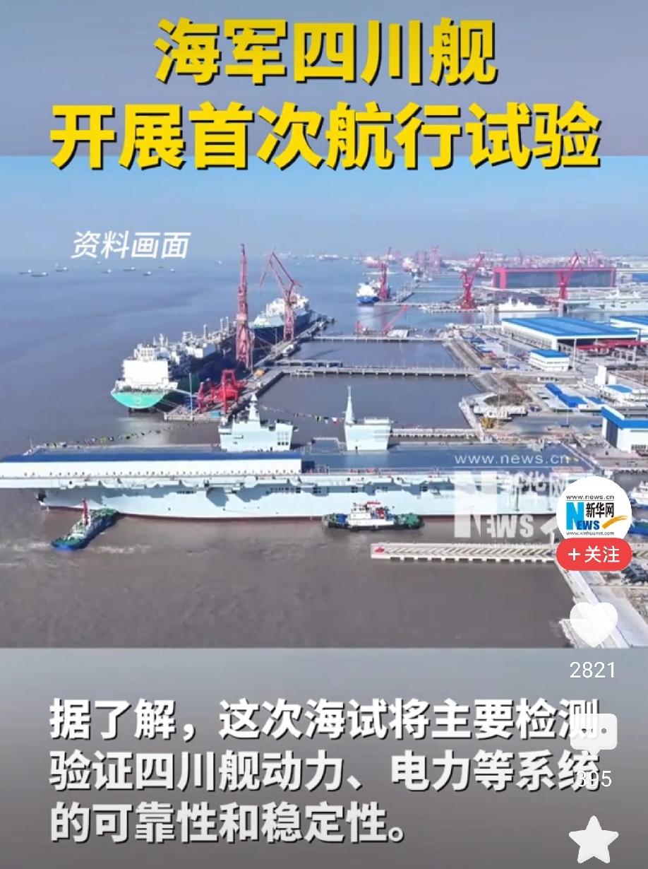 海军四川舰开展首次航行试验! 五艘拖船簇拥着那艘灰蓝色的巨舰缓缓驶离码头,这一刻,黄浦江的浪花都仿佛在为中国海军的新力量欢呼。 11月14日上午9时许,我国076两栖攻击舰首舰四川舰从上海沪东中华造船厂码头解缆启航,赴相关海域开展首次航行试验任务。这次海试将主要检测验证四川舰动力、电力等系统的可靠性和稳定性。 自2024年12月下水以来,四川舰建造工作按计划稳步推进,顺利完成系泊试验和装设备调试,具备出海试验的技术条件。 01 四川舰的磅礴气势 江风猎猎,上海沪东中华造船厂的码头上,一艘巨舰正迎着朝阳启航。四川舰的首次航行试验在今天上午9时左右正式开始。 五艘拖船小心翼翼地牵引着这艘排水量4万余吨的海上堡垒,缓缓驶向广阔的试验海域。 从空中俯瞰,四川舰的全纵通飞行甲板像一片巨大的钢铁平原,在波光粼粼的海面上投下雄伟身影。 舷号为51的这艘076两栖攻击舰,承载着中国海军迈向深蓝的又一份雄心。 双舰岛式上层建筑赋予它独特的轮廓,既现代又威武。这是中国新一代两栖攻击舰的首舰,它的每一个细节都吸引着关注中国海军发展的人们目光。 02 技术创新之路 四川舰最引人瞩目的特点当属其创新技术。它创新应用电磁弹射和阻拦技术。 这项先进技术的应用,意味着四川舰能够搭载固定翼飞机、直升机和各类两栖装备,显著提升中国海军的两栖作战能力和远洋投送能力。 与传统两栖攻击舰相比,电磁弹射技术让四川舰具备了起降更多种类飞机的能力,这在全球两栖攻击舰中都属于前沿技术。 从系泊试验到装设备调试,从下水到今日的海试,四川舰的建造进程一步一个脚印。 每一步都踏实,每一天都有进展,这正是中国军工的节奏与态度。 03 试验的意义与价值 首次航行试验,对新舰艇来说是一个至关重要的里程碑。今天四川舰出海,主要目的是检测验证动力、电力等系统的可靠性和稳定性。 海试如同一位严厉的考官,将在真实的海况中检验这艘战舰的各项性能。 动力系统是军舰的心脏,电力系统则是遍布全身的神经脉络。这两个系统的可靠性,直接关系到未来四川舰在复杂任务环境中的表现。 海上试验不同于港口内的系泊试验,它让军舰在真实海洋环境中全面展示自己的性能。 海浪、盐雾、潮湿——这些天然“考官”将一起检验四川舰的建造质量。 04 建造历程回顾 回顾四川舰的建造历程,可谓是中国速度与中国质量的生动体现。从2024年12月下水,到今天的首次海试,四川舰的建造工作始终按计划稳步推进。 在不到一年的时间里,建造团队顺利完成了一系列系泊试验和装设备调试工作,为今日的海试奠定了坚实技术基础。 系泊试验是军舰出海前的重要环节,它像是一场“期中考试”,检验着舰艇各个系统的运转情况。 而今天,四川舰终于迎来了它的“期末考试”——在真正的海洋环境中展示自己的实力。 05 未来展望与期待 站在黄浦江畔,目睹四川舰渐行渐远的背影,我们仿佛看到了中国海军的未来。 这艘076两栖攻击舰首舰,仅仅是一个开始,一个全新系列舰艇的起点。 四川舰正式服役后,将大幅提升中国海军的两栖作战能力。 它可以搭载各种飞行器和两栖装备,成为移动的海上基地,成为维护国家主权和海洋权益的重要力量。 从亚丁湾护航到也门撤侨,从海上救援到联合军演,中国海军的身影越来越多地出现在世界各大洋。 四川舰这样的新型装备加入,将为海军执行多样化任务提供更多选择、更强能力。 四川舰驶向的不仅是试验海域,更是中国海军走向深蓝的新航程。它的电磁弹射技术、它的全纵通飞行甲板、它的双舰岛设计,都在诉说着中国造舰技术的飞跃。 海浪拍打着舰体,仿佛在叩响未来海战形态的大门。 各位读者你们怎么看?欢迎在评论区讨论。