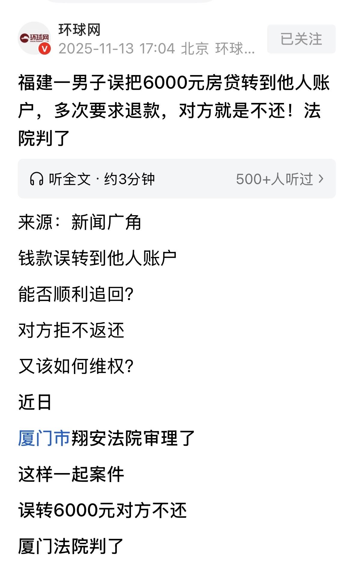 福建厦门,男子每月15号固定给儿子转6000元,供他还房贷,谁知这天,他一个手滑,把钱误转给了曾给儿子卖过二手车的商人,意识到转错钱后,男子心急如焚,给那商人又是发消息又是打电话,希望他把钱转回来,然而,人心难测,对面摊上这样天上掉馅饼的好事后,干脆昧下这笔钱,不回消息也不接电话,讨回3个月无果后,男子一纸诉状告上法院,这下玩大了! 2025年的一天,老杨做了件糊涂事。他竟把本该转给儿子还房贷的6000块钱,手指一滑误转给了一个叫大强的人。 这大强是谁呢?他是几年前给老杨儿子卖二手车的商人,但交易完后,双方早没了联系。 那时候,小杨找大强买了辆20万的二手车,老杨这个当爹的很是支持儿子,直接帮他付清了全款。 到了2020年,儿子又买了房,每月要还1万5,这让只是普通上班族的小杨顿感压力山大。 老杨再次支持儿子,每月15号都雷打不动给他转6000,好缓解他经济上的压力。 2024年12月15号下午3点,老杨照例点开手机银行。房贷账户早就设为常用收款人,但这天屏幕上突然跳出“大强”的名字。 老杨上周帮儿子查购车记录时,曾搜过他账号,所以这“大强”才会跳出来。 没等看清楚呢,老杨就习惯性地点了确认转账,几分钟后,他才惊觉转错人了。 意识到自己转错钱后,老杨连忙在微信上把这人找了出来,并接连发去几条消息,说大强兄弟,钱转错了!麻烦你再给我转回来啊!接着,老杨附上了一张转账截图。 然而,大强那边迟迟没有动静,根本不搭理在这边急得不行的老杨。 老杨急了,连打了好几个微信语音,对方不接,他就把电话翻出来,又打了几轮电话,只可惜最后全部石沉大海。 老杨怀疑,这大强就是见钱眼开,想把钱昧下,故意装没看见罢了! 而这大强竟装聋作哑3个月,一直没把钱还给老杨。 儿子劝老杨,说不行这钱就当买教训吧?老杨却坚定表示,这根本不是钱的事,凭什么他白拿? 因多次索要无果,老杨只好将大强诉至法院,让他返还自己那6000块钱。 法庭上,法官看了看老杨提交的证据材料,包括2018年大强亲笔签名的20万购车收据、2年来的24笔转账记录、2024年12月15日的错转凭证。 每一样都清清楚楚,没有半点水分。 老杨每月15号转6000元给小杨,这是持续2年的规律。2024年12月15日同金额同时间转给大强,可以判断为这就是误转。 再说双方购车款早结清,没有其他经济往来,大强收这6000元确实没道理。 那么,从法律角度,怎么看待大强的行为? 《民法典》第987条规定:得利人知道或者应当知道取得的利益没有法律根据的,受损失的人可以请求得利人返还其取得的利益并依法赔偿损失。 老杨因操作失误将本应转给儿子小杨的6000元房贷款错转至大强账户,符合不当得利的构成要件。 根据《民法典》规定,大强作为得利人,在明知或应当知道该笔6000元款项系老杨误转、缺乏法律依据的情况下,经老杨通过微信留言、语音通话等方式多次催讨后,仍未返还且始终未予回应,属于“知道或者应当知道取得的利益没有法律根据”的情形。 具体来说,大强与老杨、小杨之间的购车款已结清,且无其他经济往来,故该6000元非基于合同、债务等合法原因取得,构成不当得利。 老杨在转账当日即通过微信发送转账凭证并多次催讨,大强却拒不回复,可推定其明知或应知该笔款项系误转,仍占有拒不返还,符合“知道或者应当知道”的主观要件。 法官认为,大强收这6000块纯属“不当得利”。 最终法院判决大强必须把6000元本金还给老杨,还得按银行利率付资金占用费。 如果大家平时也遇见错转,但对面不肯还钱的情况,该怎么办呢? 第一,就是保存转账记录,立即通过手机银行、支付宝/微信账单截图或银行流水,锁定转账时间、金额、收款账户等关键信息,证明“误转”事实。 第二,留存沟通记录。通过微信、短信、电话录音等方式,向对方明确说明“转错账”情况,要求退还,并保存对方“拒绝沟通”或“承认收到但拒还”的证据。 其次,立即拨打支付平台或银行客服电话,说明情况并申请“账户冻结”或“交易撤销”,看能不能拦截资金。 如果对方迟迟不还钱,那只能拿着手上的证据,通过法律途径让对方还钱了。 这个案子也警示大家,在电子支付普及的当下,收款方如果遇到不明转账,应该主动核实或退还,而不是像大强这样,贪心昧下,否则,等待你的可能就是法律追责了! 对此,你怎么看? 关注@运良说法. 学法律知识不迷路