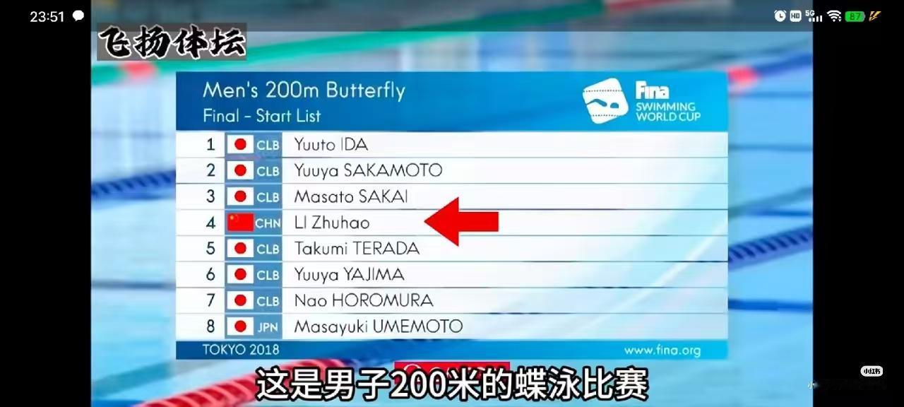 终于搞清楚了, 为什么徐嘉余被教练催促快点赶班车?李朱濠调侃说,年纪大了话就了,老人都这样! 我去查了一下这位自嘲的老人,李朱濠!他是徐嘉余的前队友,现在的教练!比徐嘉余还小4岁! 2018年世界杯日本站,一个在日本的短池比赛,算是国际最高赛事之一!一共有8道,有7道都是日本队,只有他一个人是中国队的! 当年以一敌七的抗日名将,就是他! 上届全运还拿了百蝶银呢,到这届已经是李指导了。当年也是泳界采访天才!他说200米可能不适合我! 余嘉余